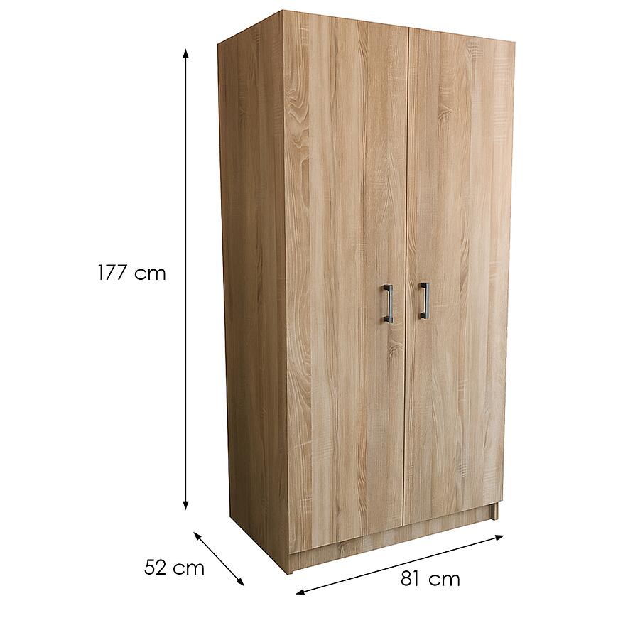 Szafa Pino 2 w kolorze sonoma to nowoczesny, funkcjonalny mebel o wymiarach 81 cm szerokości, 177 cm wysokości i 52 cm głębokości. Posiada dwie klasyczne drzwi bez lustra, wykonane z płyty wiórowej laminowanej w jasnym, matowym wykończeniu, które nadaje szafie elegancki, naturalny wygląd. Korpus szafy również wykonano z laminowanej płyty wiórowej w tym samym kolorze, co zapewnia spójny i estetyczny design. Szafa należy do kolekcji PINO, waży 51 kg i wymaga samodzielnego montażu, stanowiąc praktyczne rozwiązanie do sypialni lub garderoby.