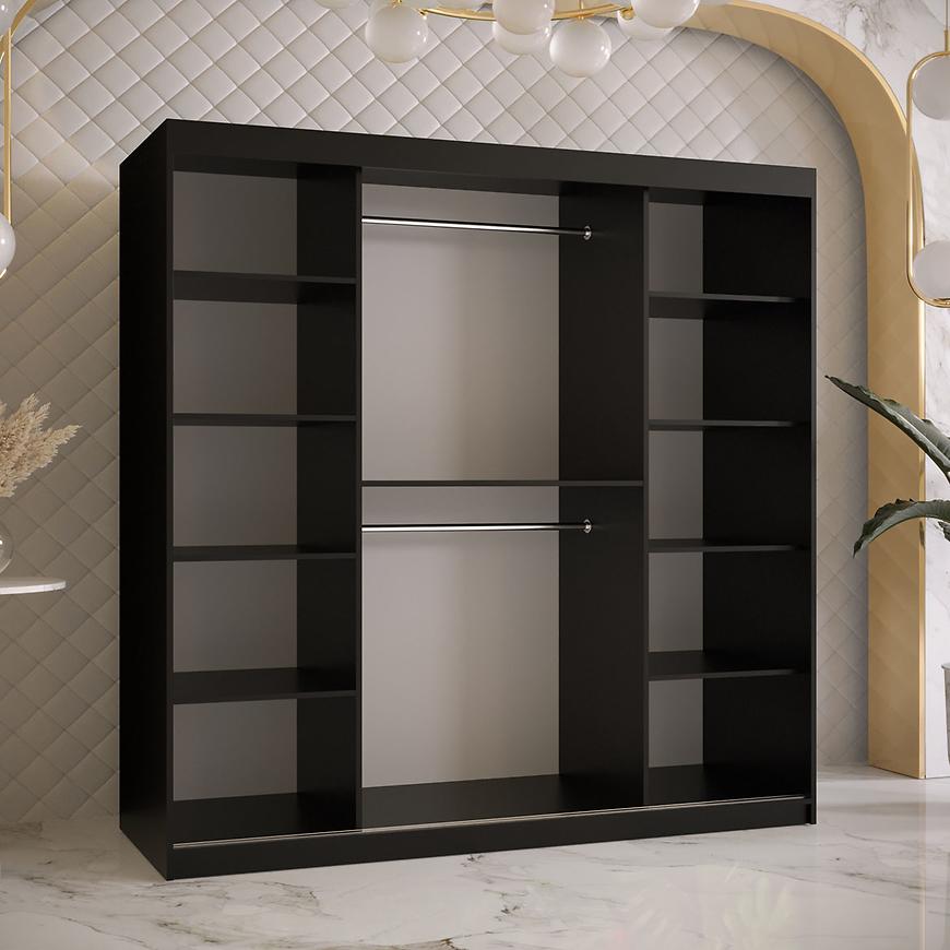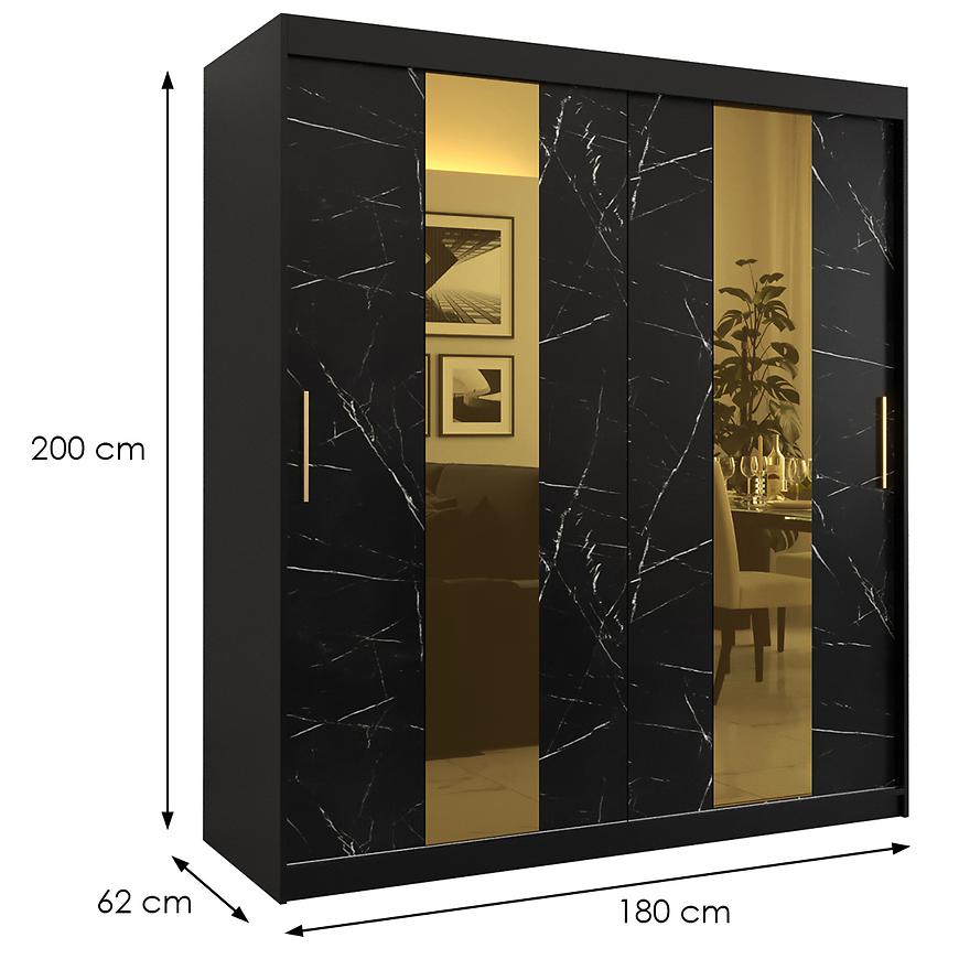 Szafa Platinum Pole w wyjątkowej kolorystyce czarnego marmuru to znakomite połączenie nowoczesnego designu z luksusowym wykończeniem. Czarny matowy korpus, kontrastujący z połyskującymi frontami w czarnym marmurze i złotym lustrze, tworzy niezwykłe połączenie elegancji i nowoczesności.