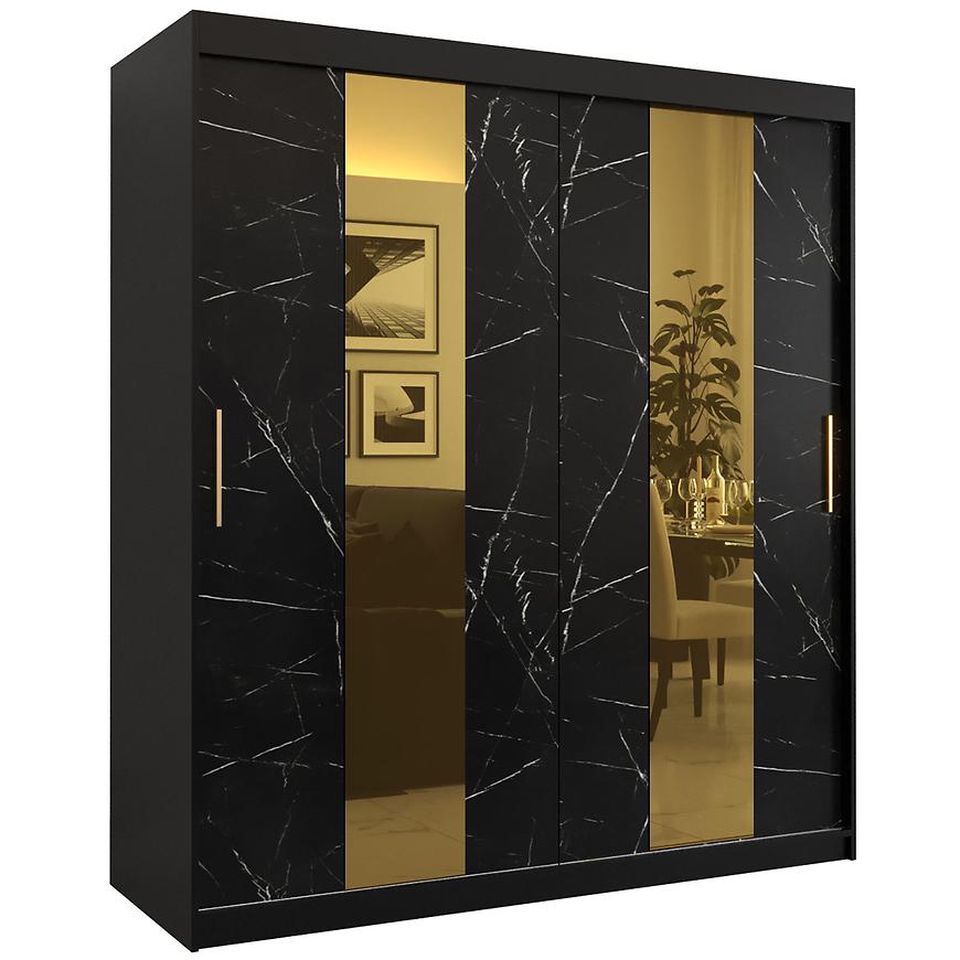 Fronty szafy w czarnym marmurze z dodatkiem złotego lustra to kompozycja barw, która nadaje meblowi wyjątkowego charakteru. Połyskujące wykończenie frontów dodaje elegancji i sprawia, że szafa staje się centralnym punktem aranżacji. Złote lustro nadaje pomieszczeniu luksusowego akcentu, jednocześnie optycznie powiększając przestrzeń.