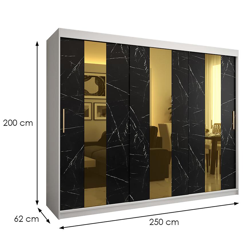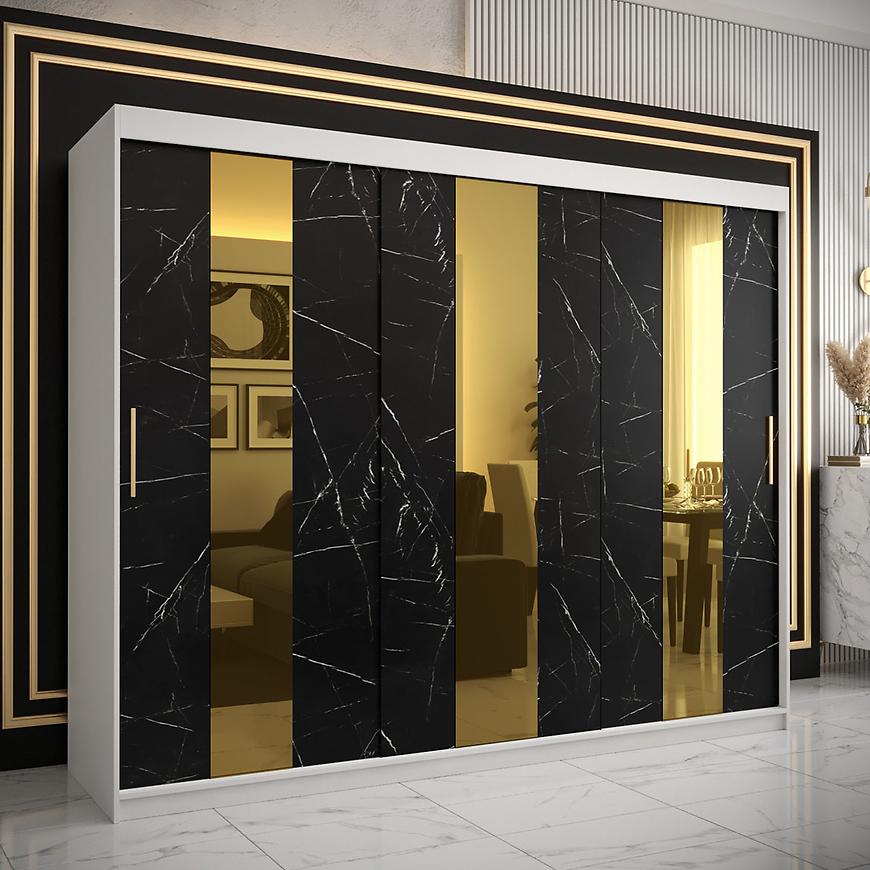 Kolor frontów w czarnym marmurze i złotym lustrze to połączenie, które przykuwa uwagę i nadaje szafie wyjątkowego, luksusowego wyglądu. Fronty w wykończeniu połyskowym dodają meblowi elegancji, a złote lustro nadaje mu subtelnego blasku. To połączenie kolorów nadaje szafie charakteru, tworząc jednocześnie efektowny element dekoracyjny w pomieszczeniu. Drzwi przesuwne to nie tylko praktyczne rozwiązanie, ale także element, który oszczędza miejsce, co jest istotne szczególnie w niewielkich pomieszczeniach. Konstrukcja pozwala na łatwe rozmieszczenie różnych elementów garderoby, utrzymując jednocześnie harmonijny wygląd.
