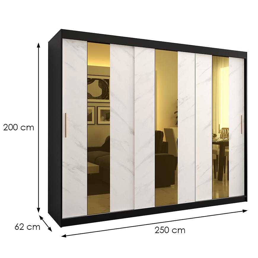 Kolor frontów w białym marmurze i złotym lustrze to połączenie, które przykuwa uwagę i nadaje szafie wyjątkowego, luksusowego wyglądu. Fronty w wykończeniu połyskowym dodają meblowi elegancji, a złote lustro nadaje mu subtelnego blasku. To połączenie kolorów nadaje szafie charakteru, tworząc jednocześnie efektowny element dekoracyjny w pomieszczeniu. Drzwi przesuwne to nie tylko praktyczne rozwiązanie, ale także element, który oszczędza miejsce, co jest istotne szczególnie w niewielkich pomieszczeniach. Konstrukcja pozwala na łatwe rozmieszczenie różnych elementów garderoby, utrzymując jednocześnie harmonijny wygląd.