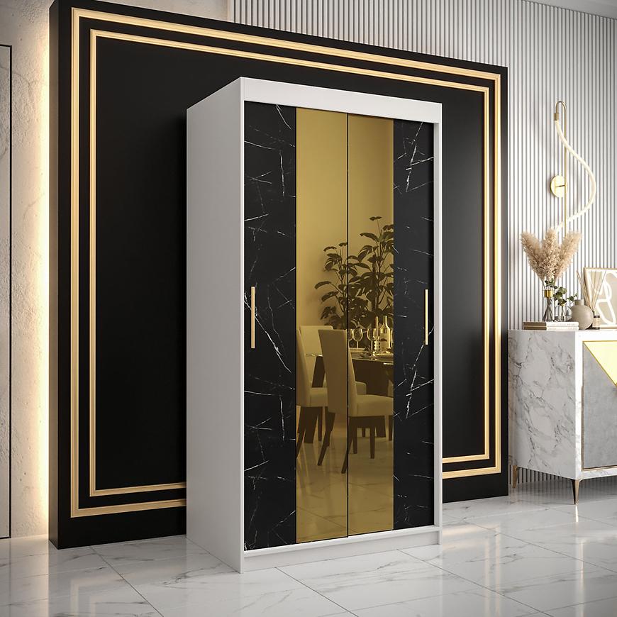 Szafa Platinum T1 to arcydzieło nowoczesnego designu, które wyróżnia się nie tylko funkcjonalnością, ale także wyjątkowym połączeniem kolorów i materiałów. Jej czarne fronty imitujące marmur w zestawieniu z złotym lustrem tworzą niepowtarzalny, luksusowy wygląd.