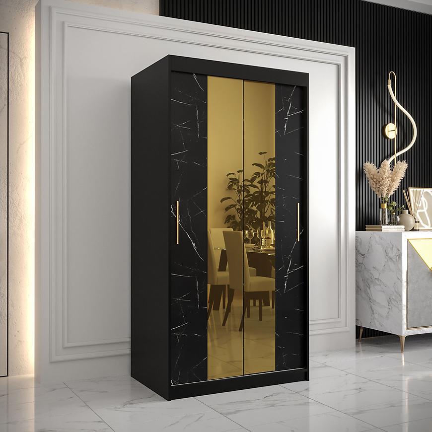 Fronty szafy w czarnym marmurze z dodatkiem złotego lustra to kompozycja barw, która nadaje meblowi wyjątkowego charakteru. Połyskujące wykończenie frontów dodaje elegancji i sprawia, że szafa staje się centralnym punktem aranżacji. Złote lustro nadaje pomieszczeniu luksusowego akcentu, jednocześnie optycznie powiększając przestrzeń.