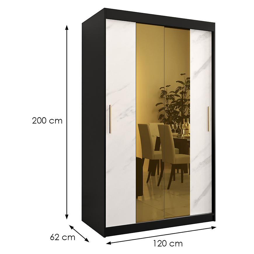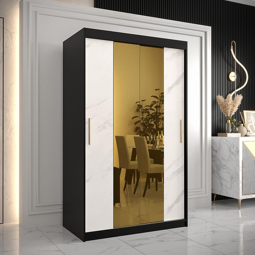 Fronty szafy, utrzymane w nowoczesnym stylu, prezentują się w kolorze białego marmuru, co dodaje wnętrzu subtelności i luksusowego charakteru. Złote lustro nadaje szafie jeszcze bardziej ekskluzywnego wyrazu.