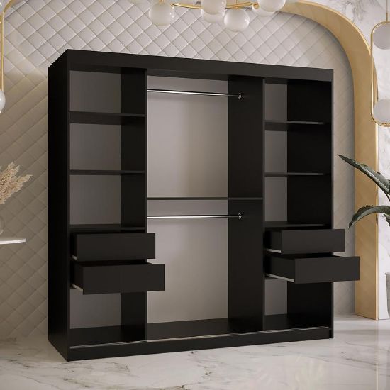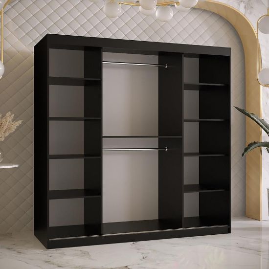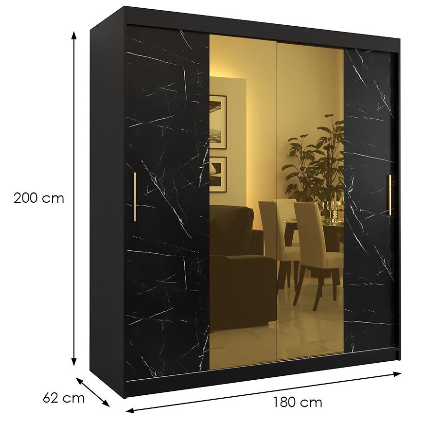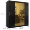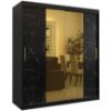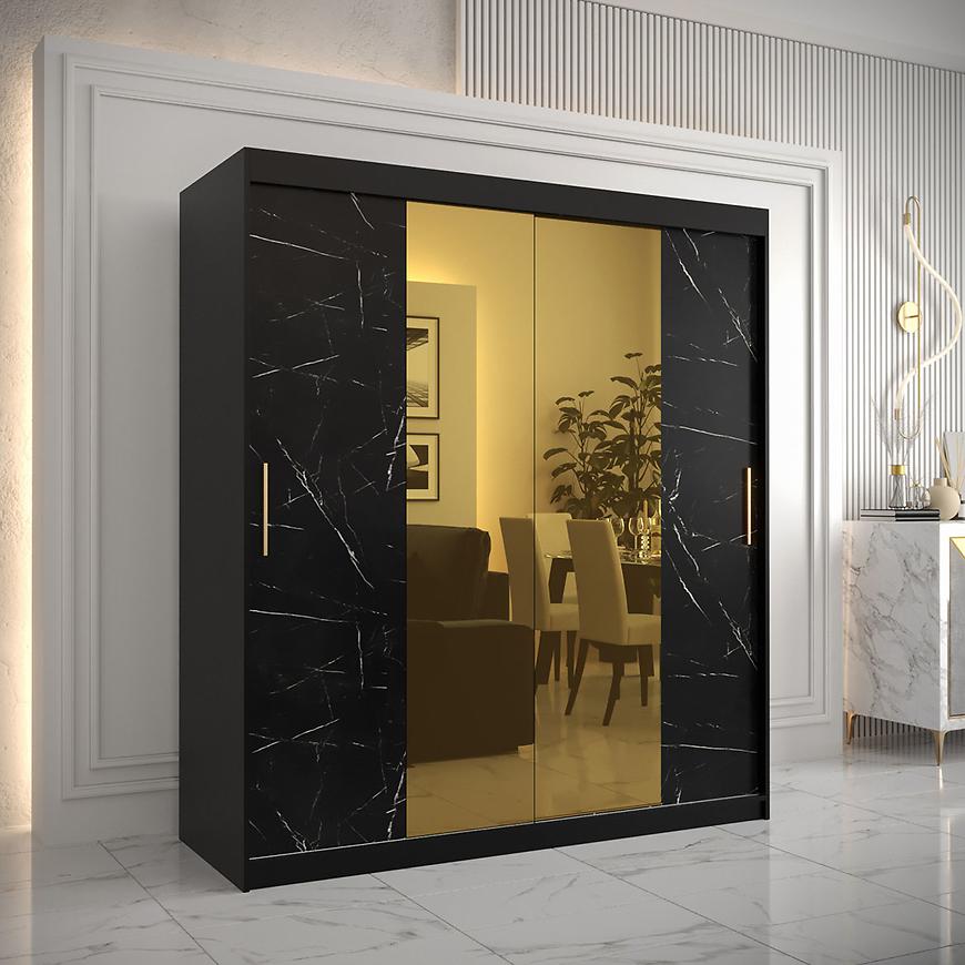 Fronty szafy, utrzymane w nowoczesnym stylu, prezentują się w kolorze czarnego marmuru, co dodaje wnętrzu subtelności i luksusowego charakteru. Złote lustro nadaje szafie jeszcze bardziej ekskluzywnego wyrazu.