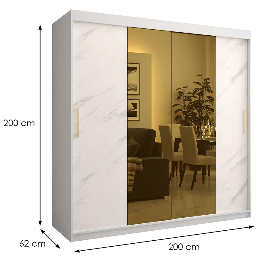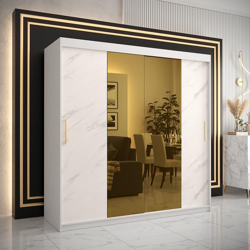 Kolor frontów, utrzymany w eleganckim białym marmurze i złotym lustrze, nadaje szafie Platinum T1 niepowtarzalny, luksusowy wygląd. To połączenie klasycznej bieli z subtelnymi złotymi akcentami sprawia, że mebel doskonale wpisuje się w nowoczesne trendy aranżacyjne.