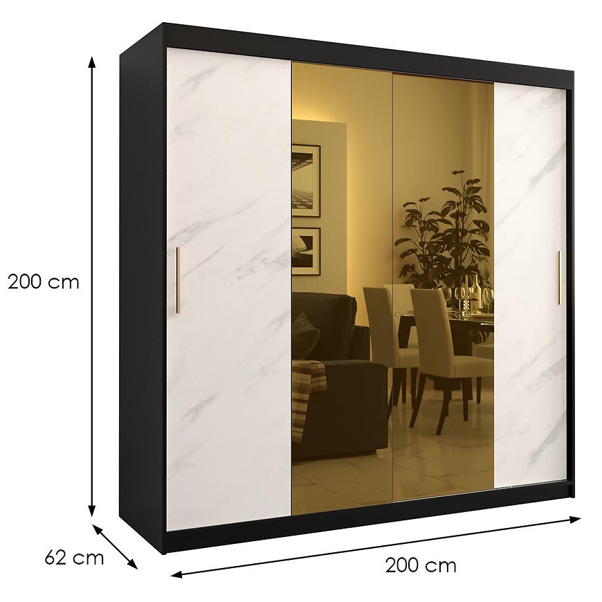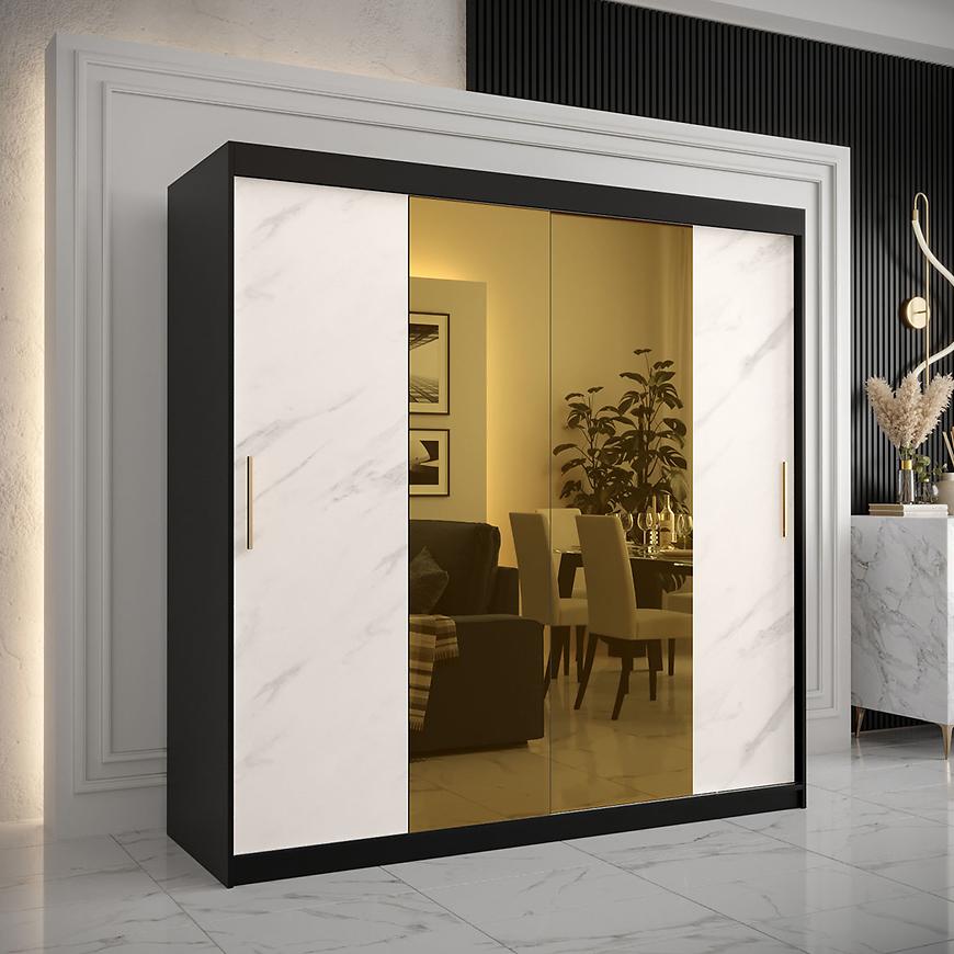 Fronty szafy, utrzymane w nowoczesnym stylu, prezentują się w kolorze białego marmuru, co dodaje wnętrzu subtelności i luksusowego charakteru. Złote lustro nadaje szafie jeszcze bardziej ekskluzywnego wyrazu.