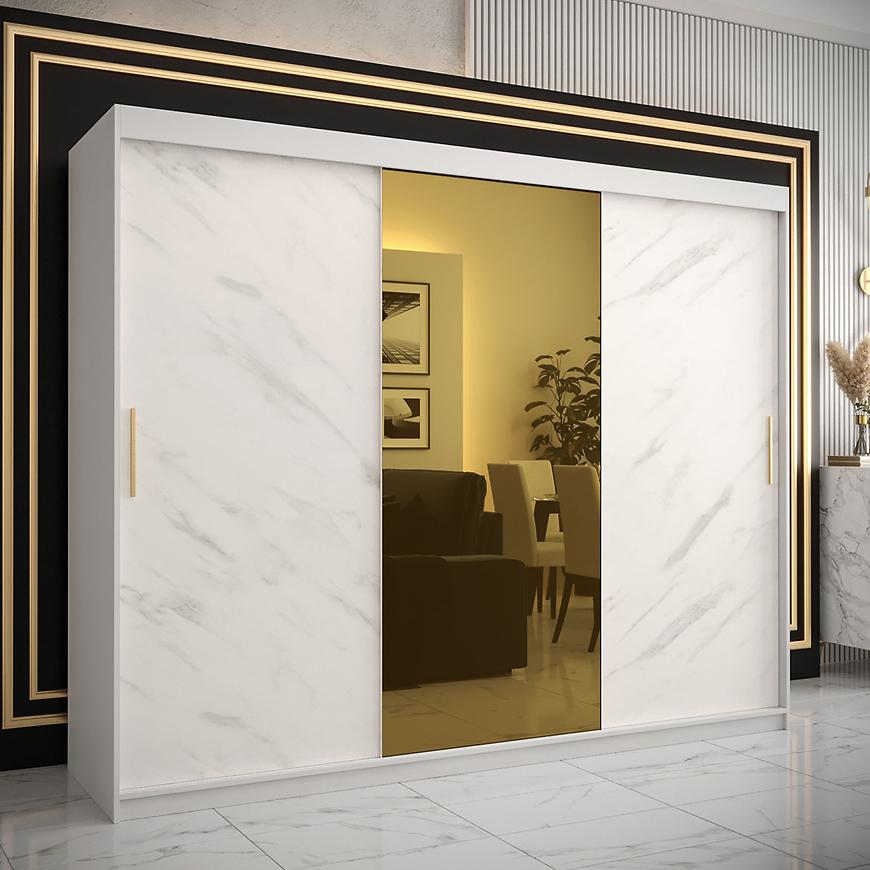Kolor frontów, utrzymany w eleganckim białym marmurze i złotym lustrze, nadaje szafie Platinum T1 niepowtarzalny, luksusowy wygląd. To połączenie klasycznej bieli z subtelnymi złotymi akcentami sprawia, że mebel doskonale wpisuje się w nowoczesne trendy aranżacyjne.