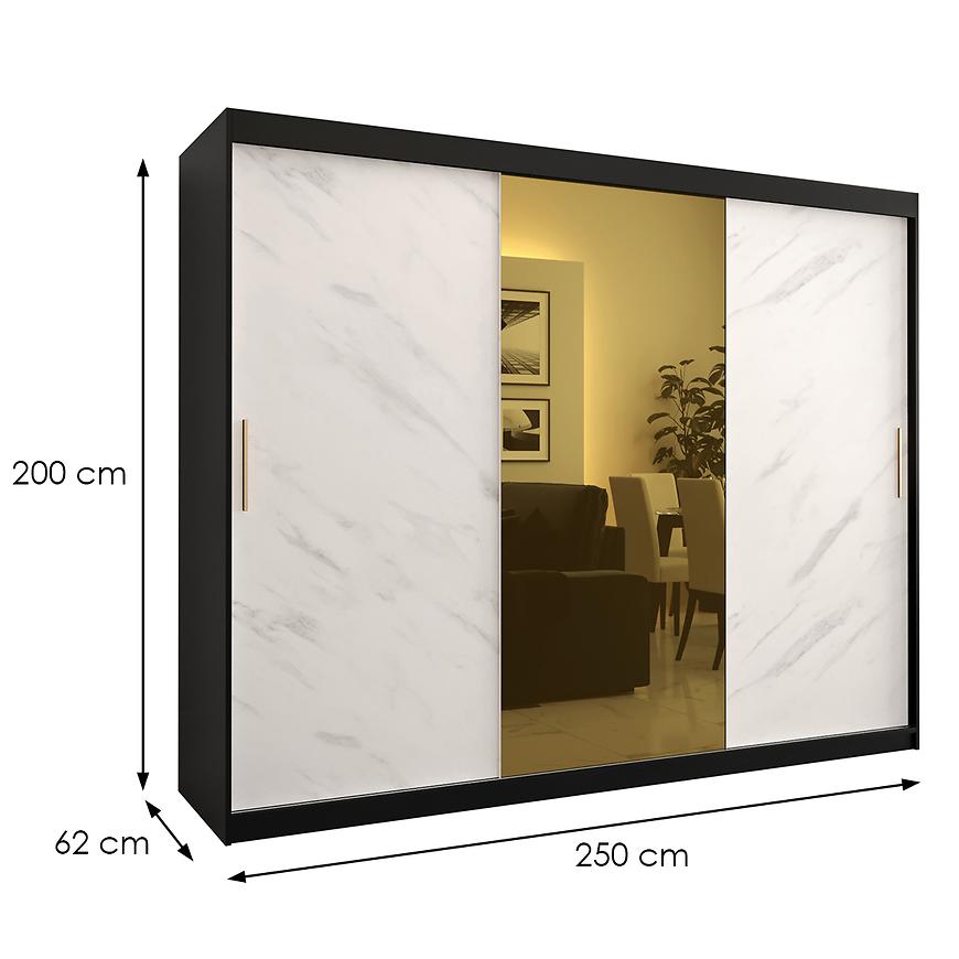 Fronty szafy, utrzymane w nowoczesnym stylu, prezentują się w kolorze białego marmuru, co dodaje wnętrzu subtelności i luksusowego charakteru. Złote lustro nadaje szafie jeszcze bardziej ekskluzywnego wyrazu.