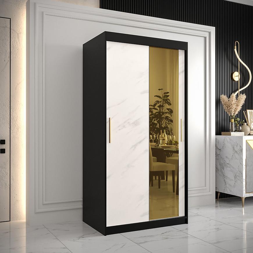 Czarne wybarwienie korpusu nadaje meblowi elegancji i ponadczasowego uroku. Kontrastuje ono z kolorowym akcentem białego marmuru na frontach, co nadaje szafie wyjątkowego charakteru. Kolorystyka ta doskonale komponuje się z nowoczesnym stylem, dodając pomieszczeniu stylowego i świeżego wyglądu.
