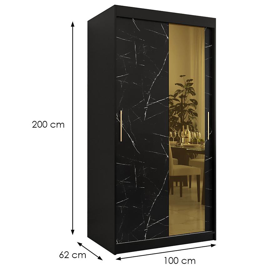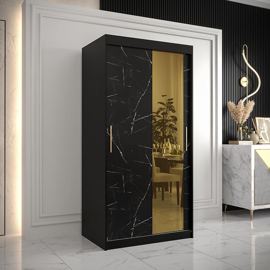 Fronty szafy, utrzymane w nowoczesnym stylu, prezentują się w kolorze czarnego marmuru, co dodaje wnętrzu subtelności i luksusowego charakteru. Złote lustro nadaje szafie jeszcze bardziej ekskluzywnego wyrazu.
