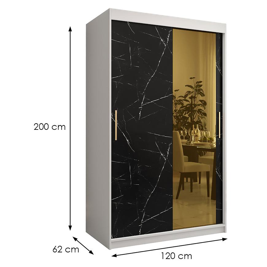 Czarne fronty imitujące marmur w połączeniu z złotym lustrem nadają szafie Platinum T2 eleganckiego i luksusowego charakteru. To kontrastowe zestawienie kolorów tworzy efektowny mebel, który stanowi centralny punkt wnętrza.