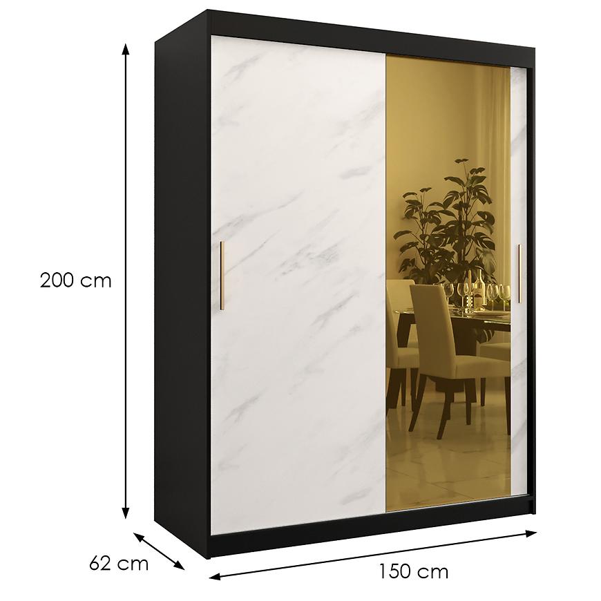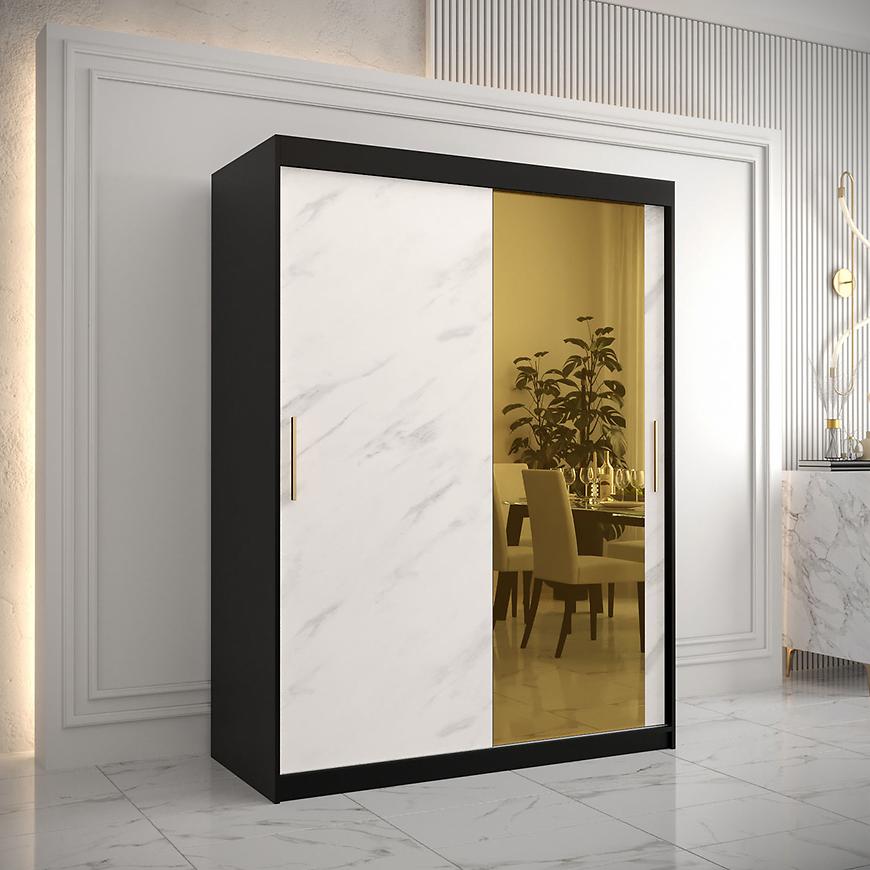 Czarne wybarwienie korpusu nadaje meblowi elegancji i ponadczasowego uroku. Kontrastuje ono z kolorowym akcentem białego marmuru na frontach, co nadaje szafie wyjątkowego charakteru. Kolorystyka ta doskonale komponuje się z nowoczesnym stylem, dodając pomieszczeniu stylowego i świeżego wyglądu.