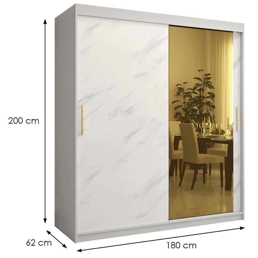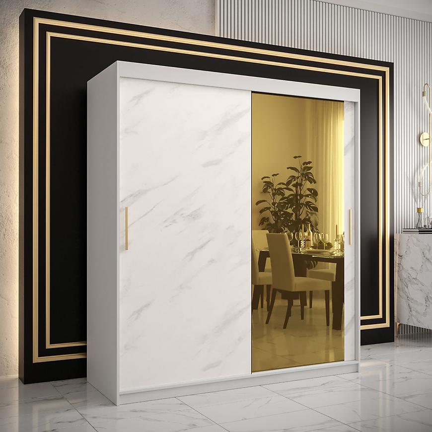 Kolor frontów utrzymany w eleganckim białym marmurze i złotym lustrze nadaje szafie Platinum T2 wyjątkowy charakter. To połączenie klasycznej bieli z delikatnymi złotymi akcentami tworzy efektowny mebel, który doskonale wpisuje się w nowoczesne trendy aranżacyjne.