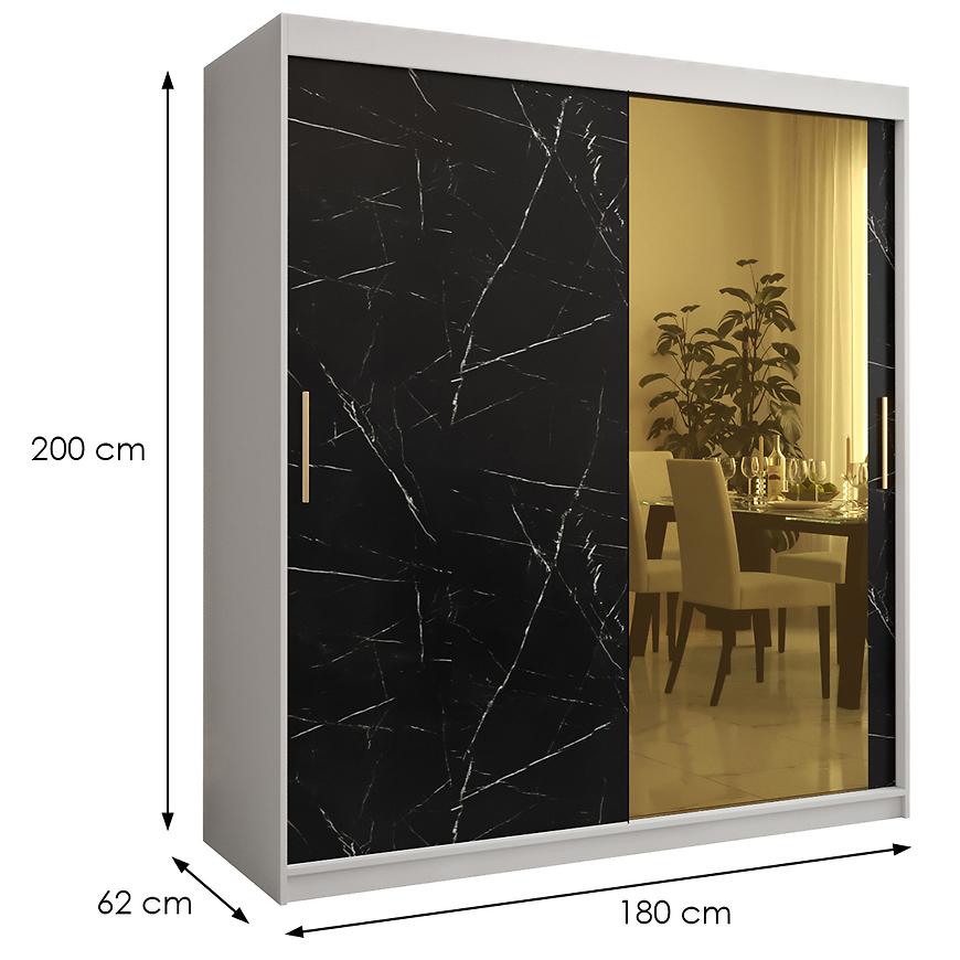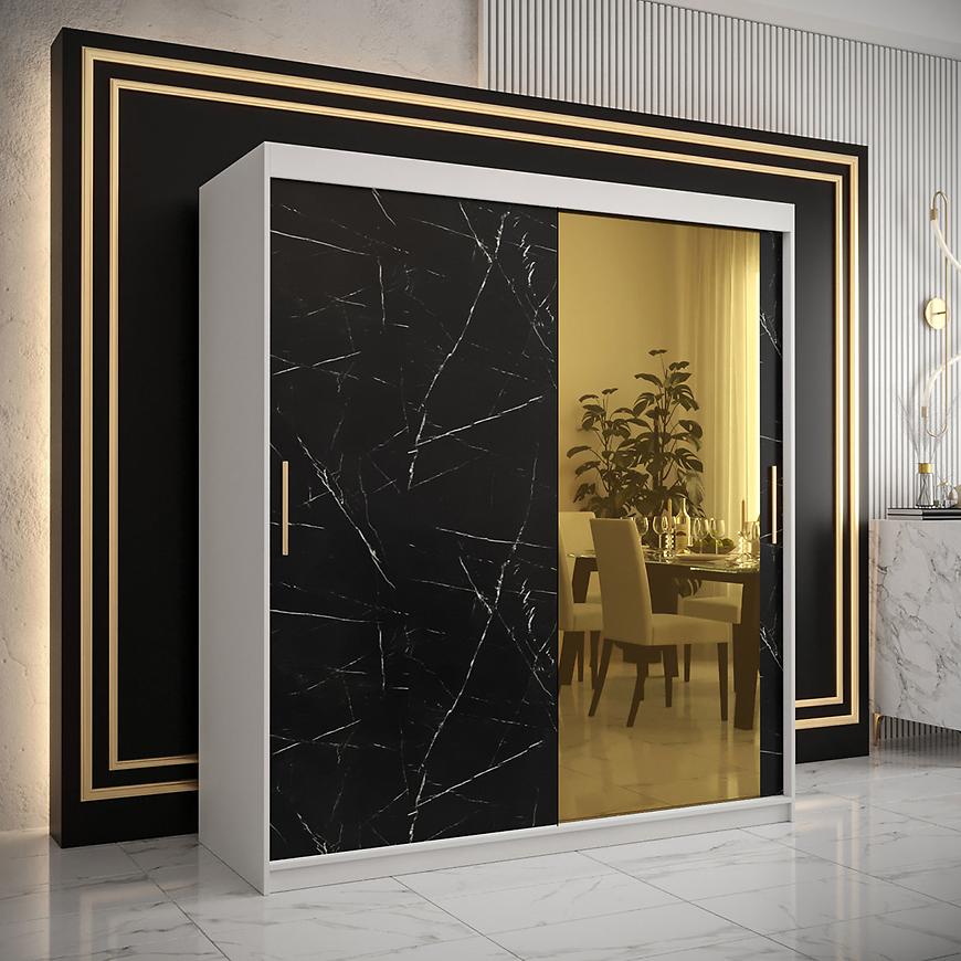 Czarne fronty imitujące marmur w połączeniu z złotym lustrem nadają szafie Platinum T2 eleganckiego i luksusowego charakteru. To kontrastowe zestawienie kolorów tworzy efektowny mebel, który stanowi centralny punkt wnętrza.