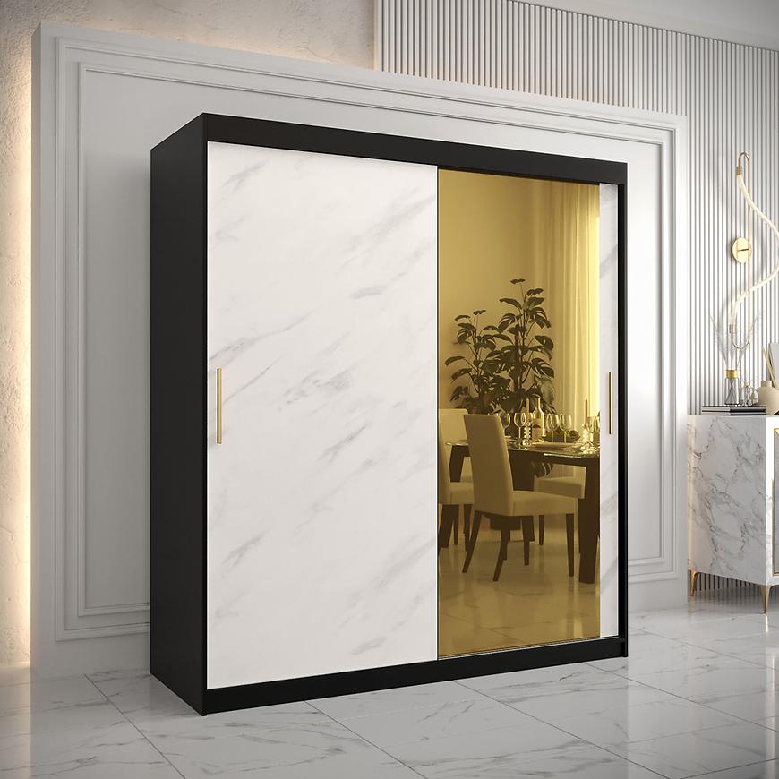 Czarne wybarwienie korpusu nadaje meblowi elegancji i ponadczasowego uroku. Kontrastuje ono z kolorowym akcentem białego marmuru na frontach, co nadaje szafie wyjątkowego charakteru. Kolorystyka ta doskonale komponuje się z nowoczesnym stylem, dodając pomieszczeniu stylowego i świeżego wyglądu.