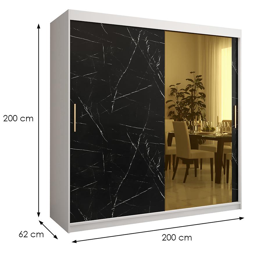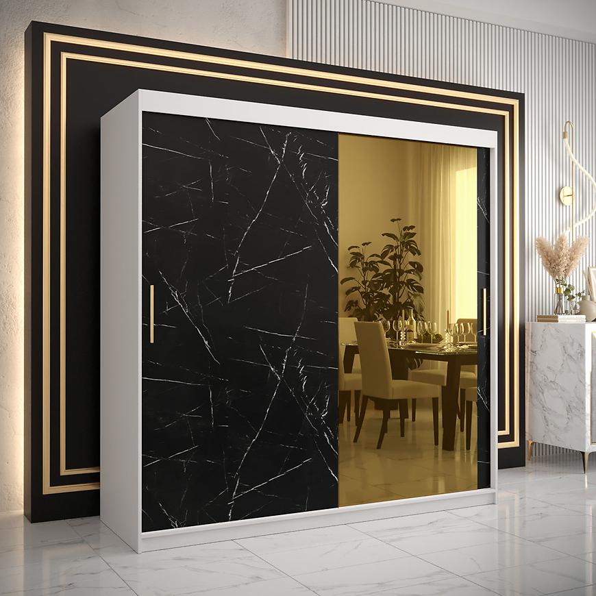 Czarne fronty imitujące marmur w połączeniu z złotym lustrem nadają szafie Platinum T2 eleganckiego i luksusowego charakteru. To kontrastowe zestawienie kolorów tworzy efektowny mebel, który stanowi centralny punkt wnętrza.