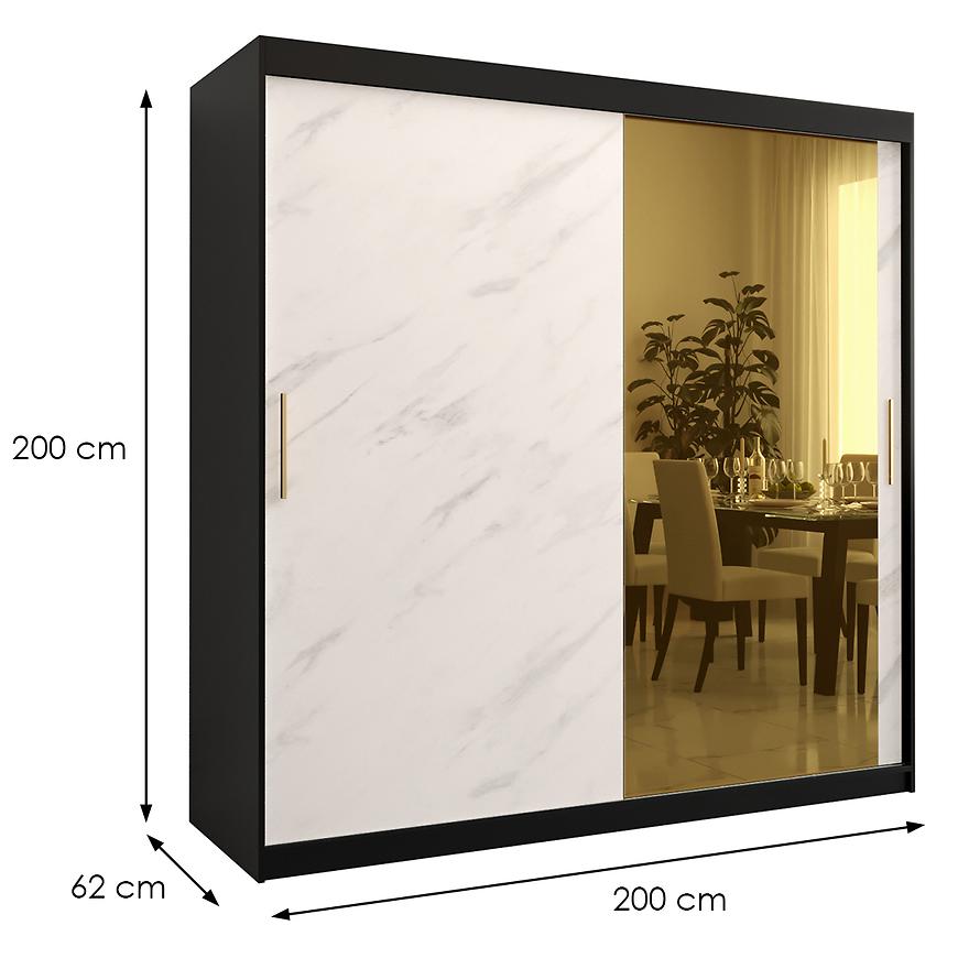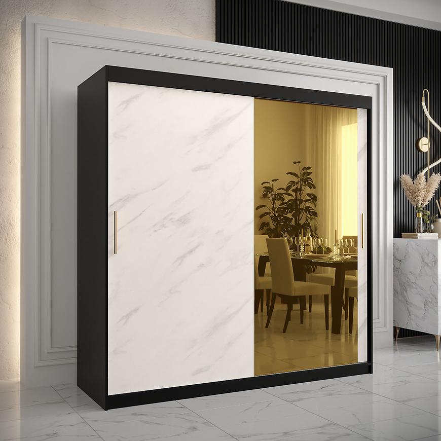 Czarne wybarwienie korpusu nadaje meblowi elegancji i ponadczasowego uroku. Kontrastuje ono z kolorowym akcentem białego marmuru na frontach, co nadaje szafie wyjątkowego charakteru. Kolorystyka ta doskonale komponuje się z nowoczesnym stylem, dodając pomieszczeniu stylowego i świeżego wyglądu.