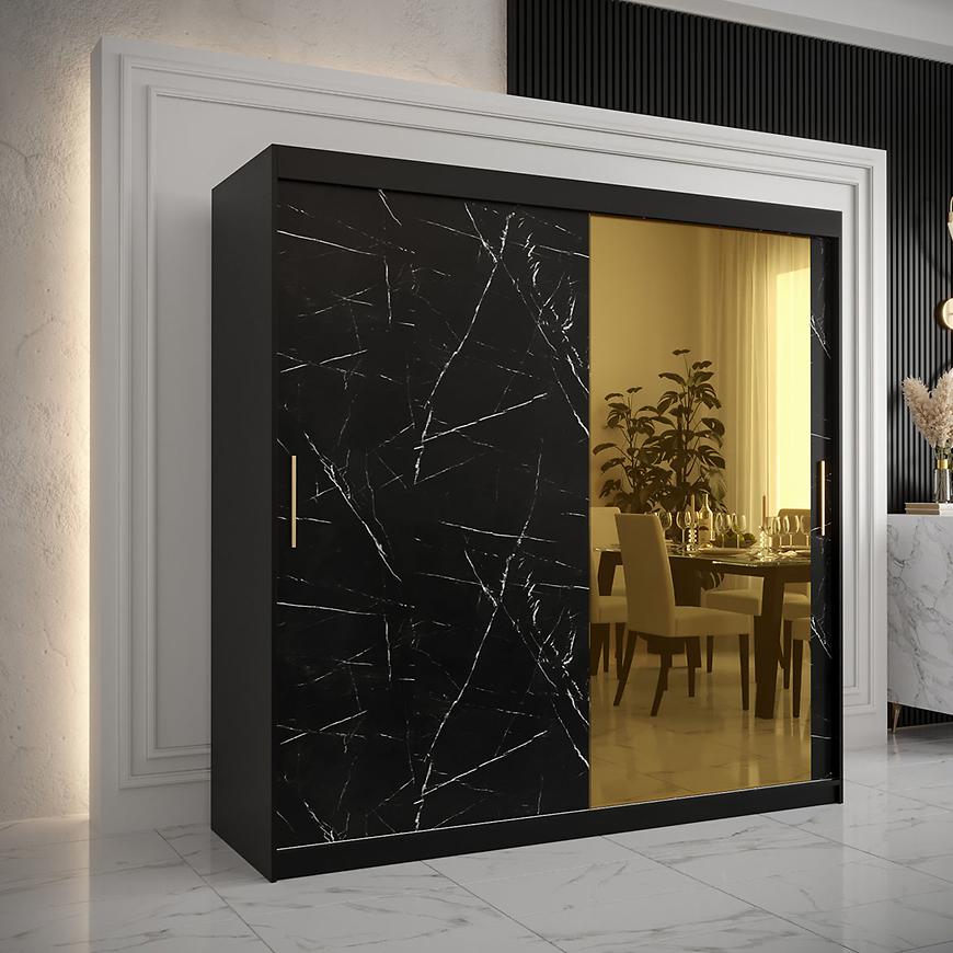 Fronty szafy, utrzymane w nowoczesnym stylu, prezentują się w kolorze czarnego marmuru, co dodaje wnętrzu subtelności i luksusowego charakteru. Złote lustro nadaje szafie jeszcze bardziej ekskluzywnego wyrazu.