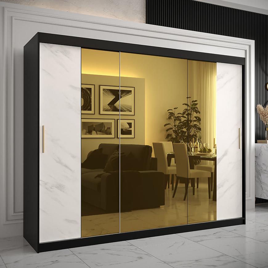 Czarne wybarwienie korpusu nadaje meblowi elegancji i ponadczasowego uroku. Kontrastuje ono z kolorowym akcentem białego marmuru na frontach, co nadaje szafie wyjątkowego charakteru. Kolorystyka ta doskonale komponuje się z nowoczesnym stylem, dodając pomieszczeniu stylowego i świeżego wyglądu.