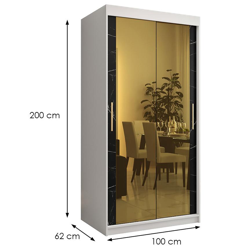 Czarne fronty imitujące marmur w zestawieniu z złotym lustrem nadają szafie Platinum T3 luksusowego wyglądu. To kontrastowe połączenie kolorów tworzy efektowny mebel, który przyciąga uwagę i stanowi wyjątkową ozdobę wnętrza.
