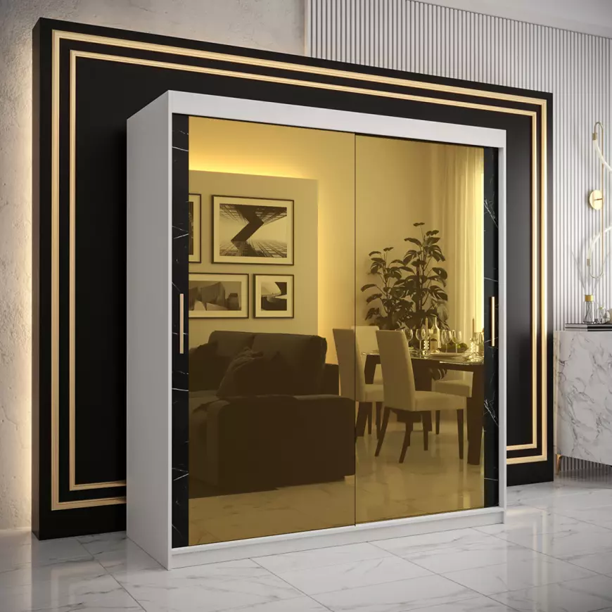 Czarne fronty imitujące marmur w zestawieniu z złotym lustrem nadają szafie Platinum T3 luksusowego wyglądu. To kontrastowe połączenie kolorów tworzy efektowny mebel, który przyciąga uwagę i stanowi wyjątkową ozdobę wnętrza.
