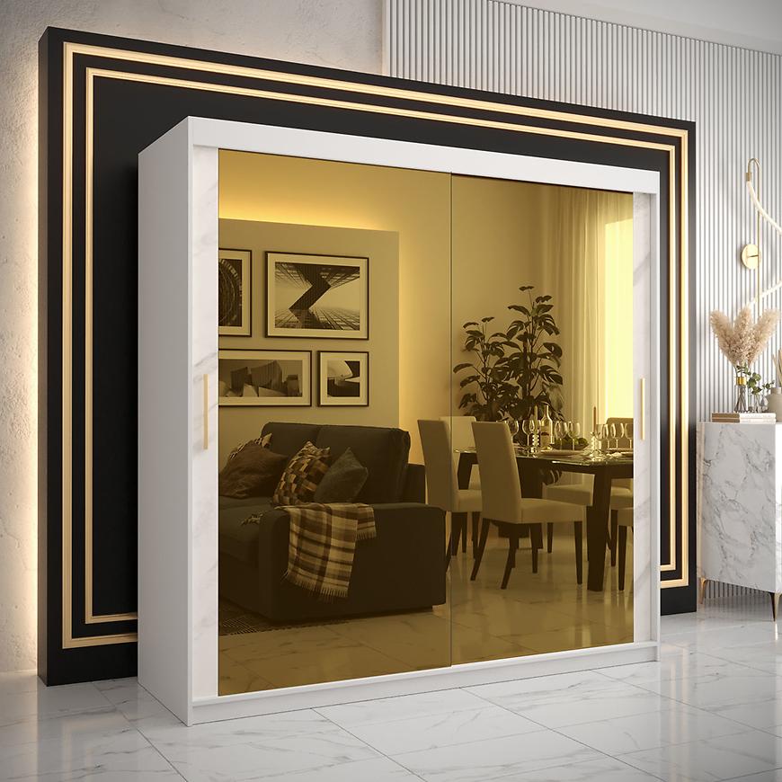 Wybarwienie szafy Platinum T3 utrzymane jest w stonowanym białym kolorze, co nadaje meblowi uniwersalny charakter. Kolor frontów, biały marmur ze złotym lustrem, dodaje elegancji i luksusu, tworząc subtelny kontrast z resztą mebla.