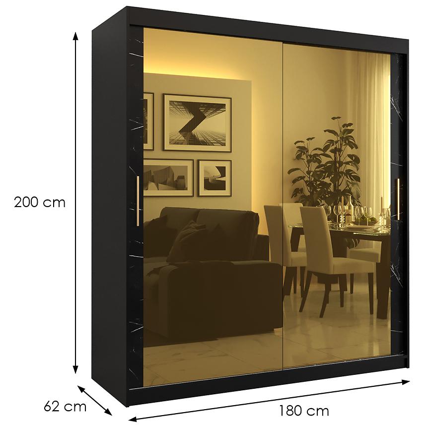 Fronty szafy, utrzymane w nowoczesnym stylu, prezentują się w kolorze czarnego marmuru, co dodaje wnętrzu subtelności i luksusowego charakteru. Złote lustro nadaje szafie jeszcze bardziej ekskluzywnego wyrazu.