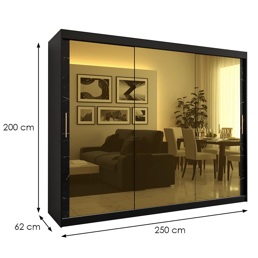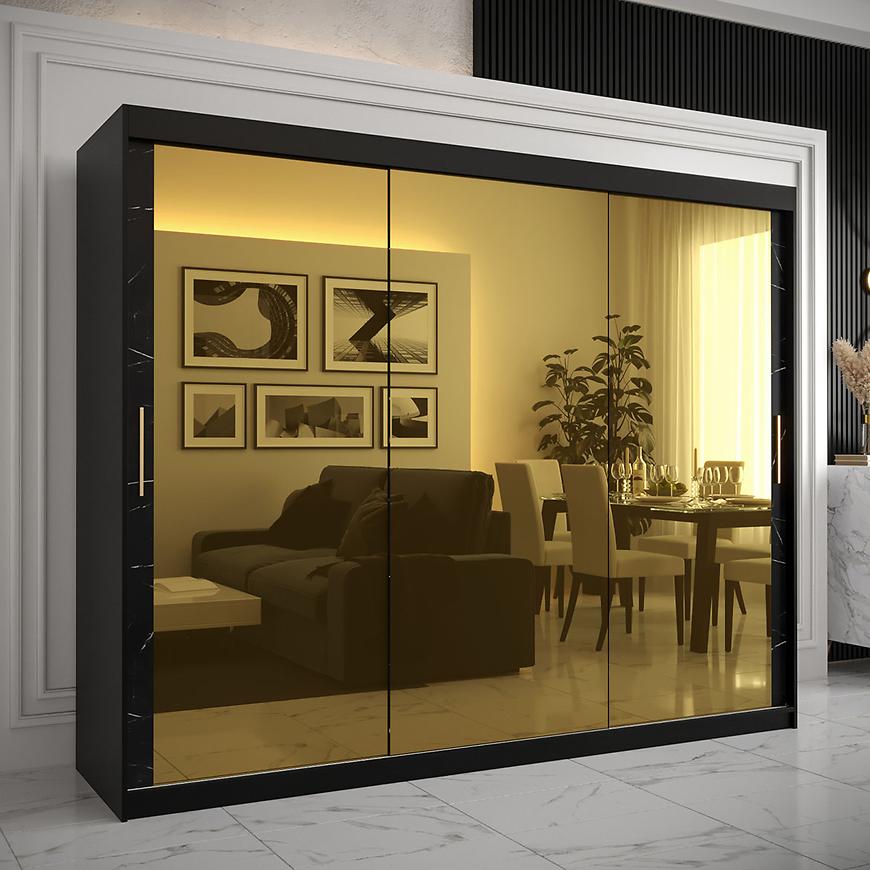 Fronty szafy, utrzymane w nowoczesnym stylu, prezentują się w kolorze czarnego marmuru, co dodaje wnętrzu subtelności i luksusowego charakteru. Złote lustro nadaje szafie jeszcze bardziej ekskluzywnego wyrazu.