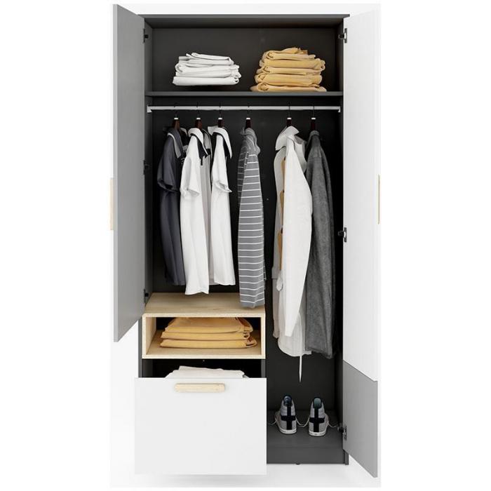 Szafa w kolorze grafit/buk ibsen/szary jasny/biały z serii Pok to doskonała propozycja do dziecka, młodzieżowego, ale znajdzie swoje miejsce również w innym pomieszczeniu, jak na przykład - przedpokój czy garderobie, sypialni. Materiał wykonania to płyta laminowana wykończonej trwałym obrzeżem ABS. Uchwyty z drewna bukowego. Szafa posiada półki, drążek na ubrania oraz szuflady. Mebel będzie świetnym miejscem do wieszania ubrań, na buty lub inne domowe tekstylia. Nowoczesny styl mebli wpadnie do gustu każdemu, kto poszukuje eleganckiego, klasycznego, a zarazem nowoczesnego umeblowania. Idealnie wpasuje się w większość aranżacji. Szafa przeznaczona do samodzielnego montażu.