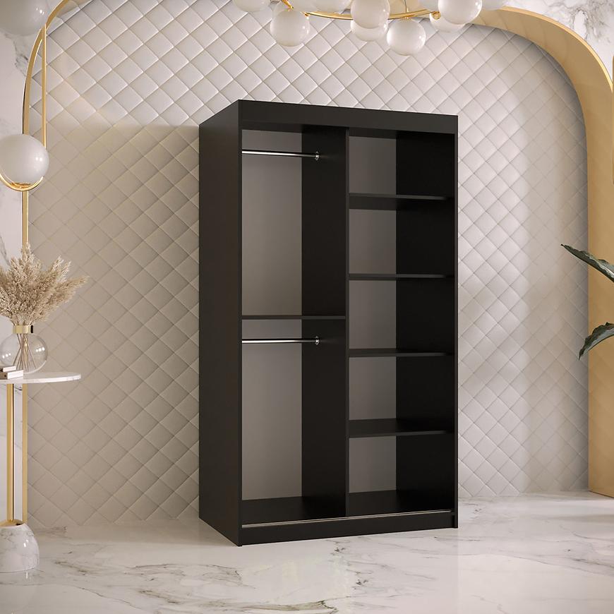Kolor frontów szafy Prego nadaje meblowi wyrafinowanego wyglądu. Fronty wykonane są z trwałej płyty wiórowej laminowanej, co gwarantuje nie tylko estetykę, ale także trwałość mebla. Matowe wykończenie dodaje szafie nowoczesności i eliminuje odblaski świetlne. Korpus szafy Prego utrzymany jest w czarnym matowym kolorze, co tworzy spójny i elegancki wygląd całego mebla. Konstrukcja korpusu oparta jest na solidnej płycie wiórowej laminowanej, co gwarantuje trwałość i stabilność szafy.
