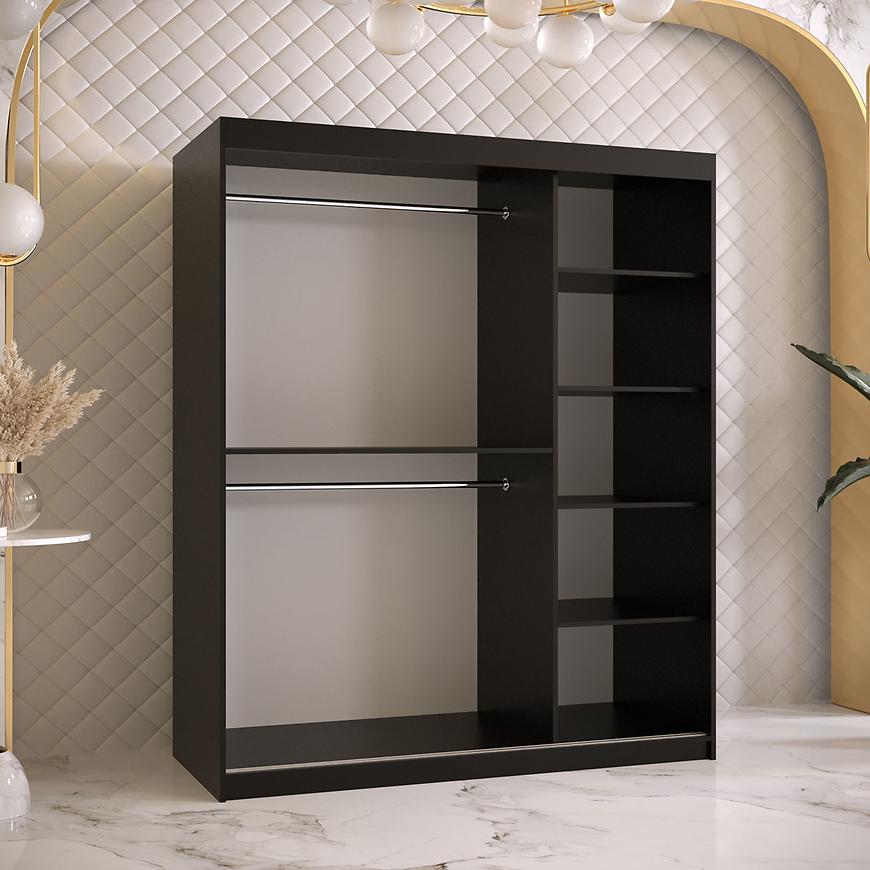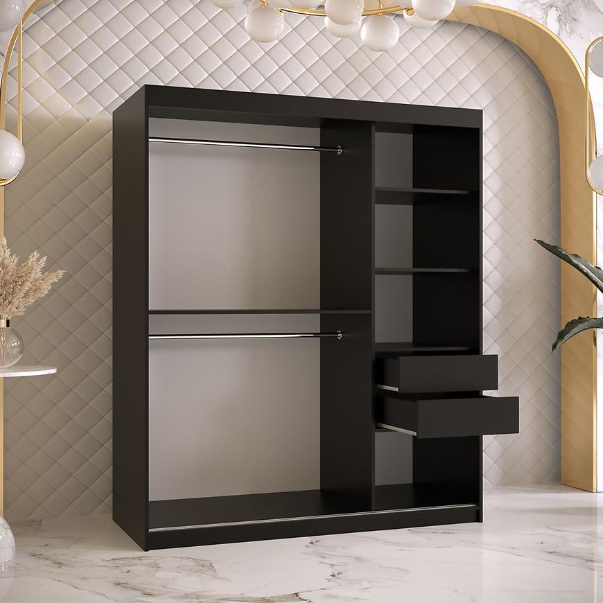 Kolor frontów szafy Prego nadaje meblowi wyrafinowanego wyglądu. Fronty wykonane są z trwałej płyty wiórowej laminowanej, co gwarantuje nie tylko estetykę, ale także trwałość mebla. Matowe wykończenie dodaje szafie nowoczesności i eliminuje odblaski świetlne. Korpus szafy Prego utrzymany jest w czarnym matowym kolorze, co tworzy spójny i elegancki wygląd całego mebla. Konstrukcja korpusu oparta jest na solidnej płycie wiórowej laminowanej, co gwarantuje trwałość i stabilność szafy.