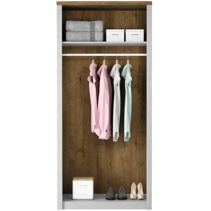 Szafa w kolorze sosna andersen/dąb lefkas ciemny z kolekcji Prowansja to doskonała propozycja do pokoju dziennego, ale znajdzie swoje miejsce również w innym pomieszczeniu, jak na przykład - przedpokój czy garderobie, sypialni. Materiał wykonania to płyta meblowa. Szafa posiada półki i drążek na ubrania. Wygląd szafy sprawi, że wpasuje się w większość aranżacji. Szafa będzie świetnym miejscem do wieszania ubrań, na buty lub inne domowe tekstylia. Nowoczesny styl mebli wpadnie do gustu każdemu, kto poszukuje eleganckiego, klasycznego, a zarazem nowoczesnego umeblowania. Szafa przeznaczona do samodzielnego montażu.
