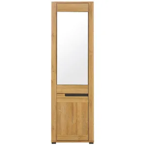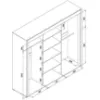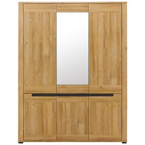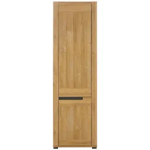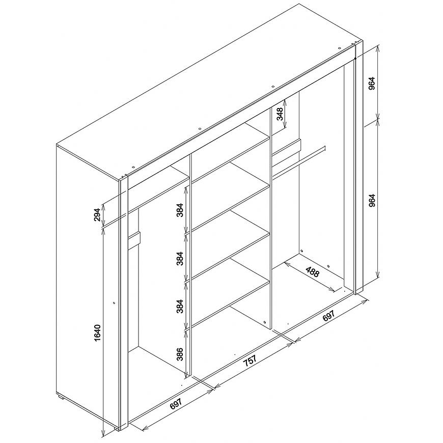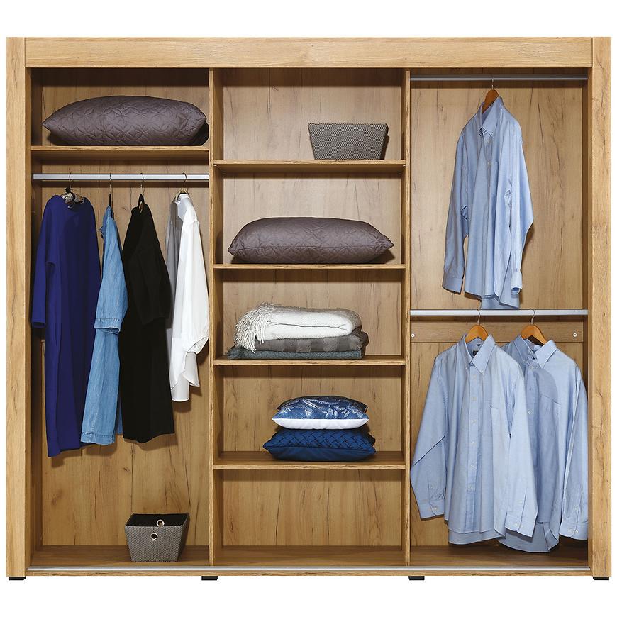 Wewnątrz znajduje się praktyczny układ półek i drążek na ubrania, umożliwiający wygodne przechowywanie odzieży oraz innych akcesoriów. Korpus wykonany z laminowanej płyty wiórowej zapewnia trwałość i odporność na codzienne użytkowanie.