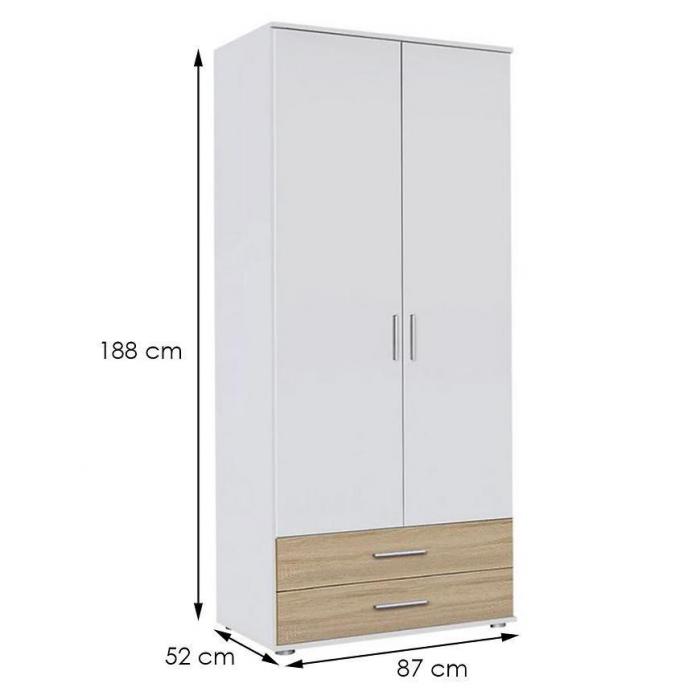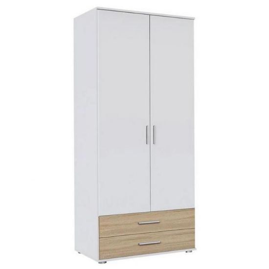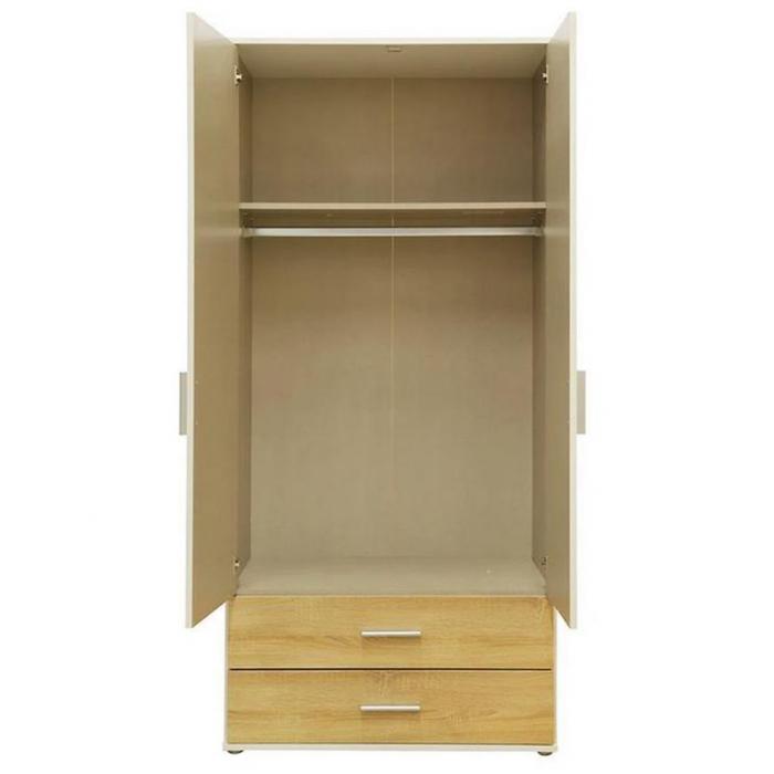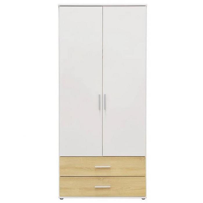 Szafa uchylna w kolorze biel alpejska/dąb sonoma propozycja do pokoju dziennego, ale znajdzie swoje miejsce również w innym pomieszczeniu, jak na przykład - przedpokój czy garderobie. Materiał wykonania to płyta wiórowa laminowana. Szafa posiada drążek na ubrania oraz szuflady. Nowoczesny styl mebli wpadnie do gustu każdemu, kto poszukuje eleganckiego, klasycznego, a zarazem nowoczesnego umeblowania. Idealnie wpasuje się w większość aranżacji. Przeznaczona do samodzielnego montażu.
