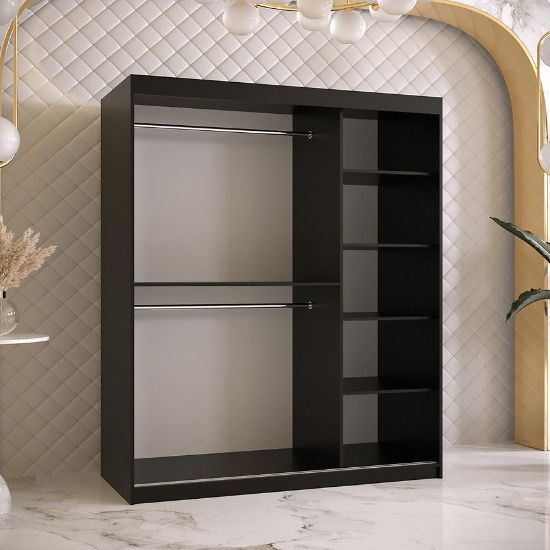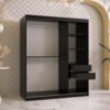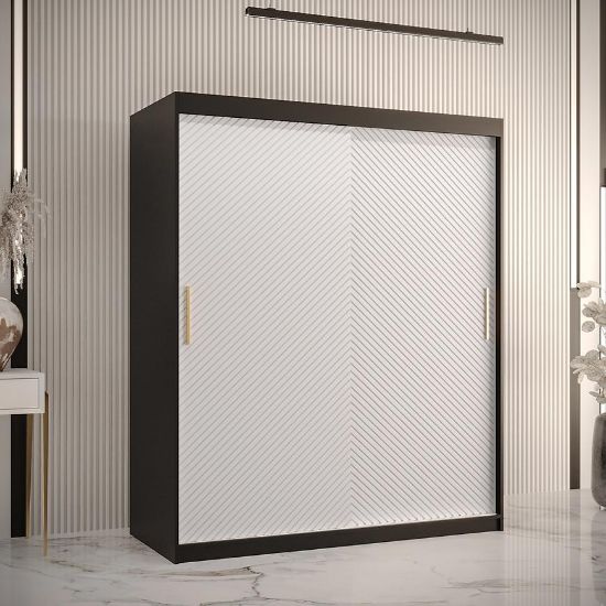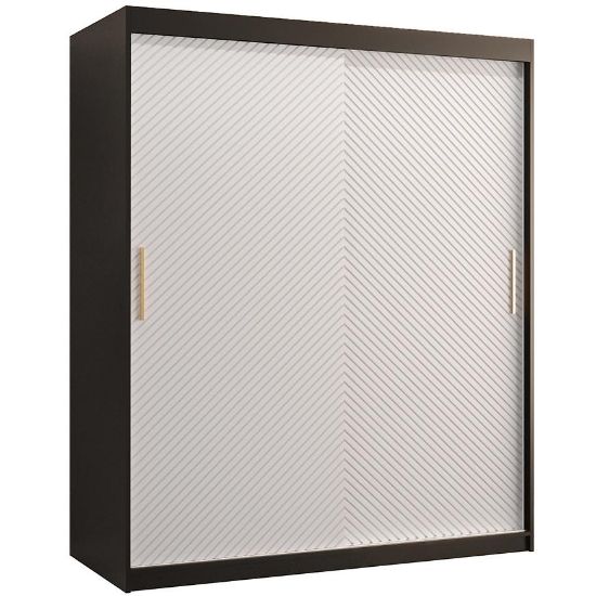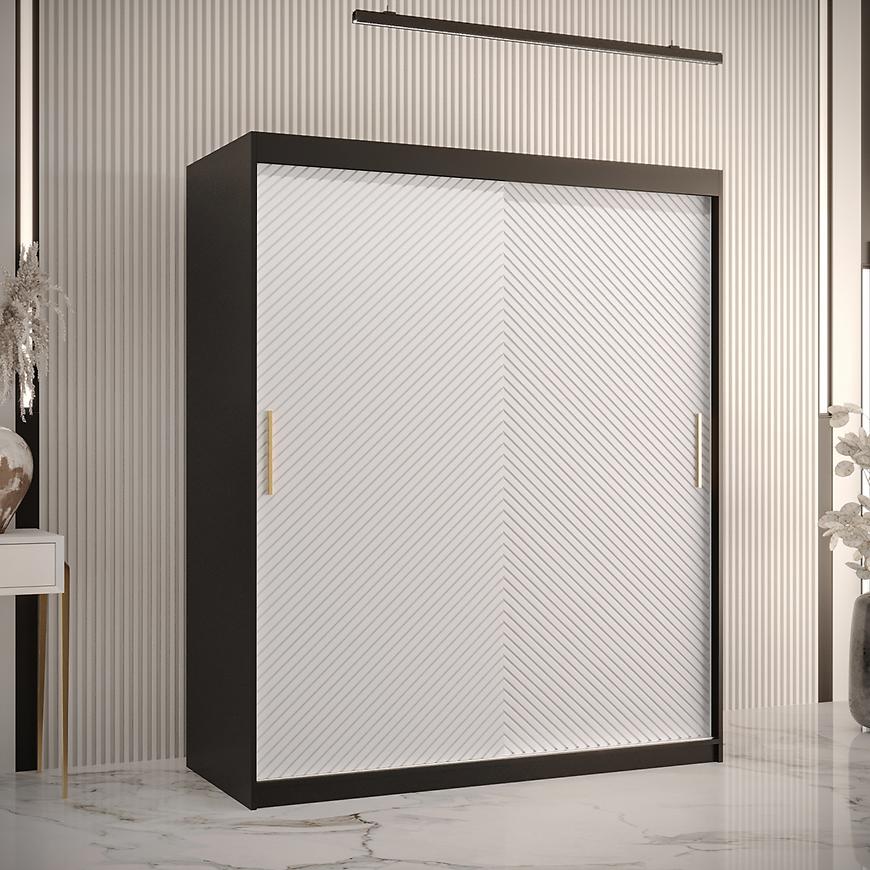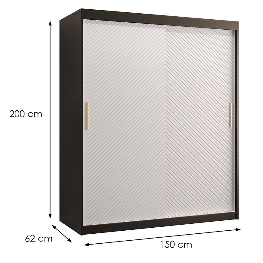 Dwudrzwiowa konstrukcja z drzwiami przesuwnymi zapewnia łatwy dostęp do wnętrza, jednocześnie oszczędzając cenną przestrzeń. Białe, matowe fronty wykonane z płyty MDF nadają szafie nowoczesnego charakteru, podkreślając jednocześnie jej wyjątkową trwałość. Złote uchwyty dodają subtelności i luksusowego akcentu, tworząc harmonijną całość z głębokim, matowym czarnym wykończeniem korpusu, wykonanym z solidnej płyty wiórowej laminowanej. Ta kombinacja gwarantuje trwałość i odporność na codzienne użytkowanie.