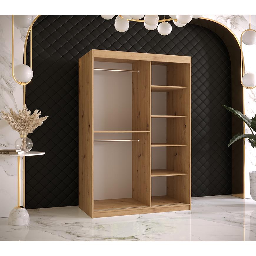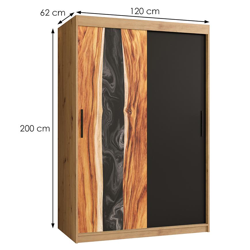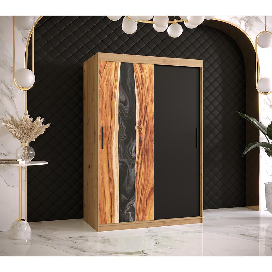 Dąb artisan korpus szafy stanowi neutralną bazę, dodającą charakteru całej kolekcji. Czarny front drzwi dodaje industrialnego charakteru, wprowadzając do wnętrza nutę nowoczesnej elegancji. To kontrastowe połączenie kolorystyczne sprawia, że szafa Resin staje się nie tylko praktycznym rozwiązaniem, ale również designerskim akcentem w Twoim wnętrzu.