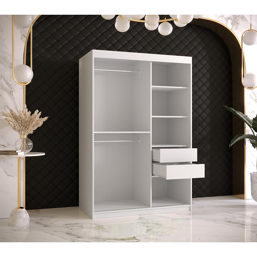 Dwudrzwiowy segment z drzwiami przesuwnymi oferuje wyjątkową przestrzeń przechowywania z myślą o Twoich potrzebach. Wnętrze szafy zostało inteligentnie zaprojektowane, wyposażone w dwa praktyczne drążki na ubrania, umożliwiające zorganizowanie garderoby w sposób funkcjonalny i estetyczny.