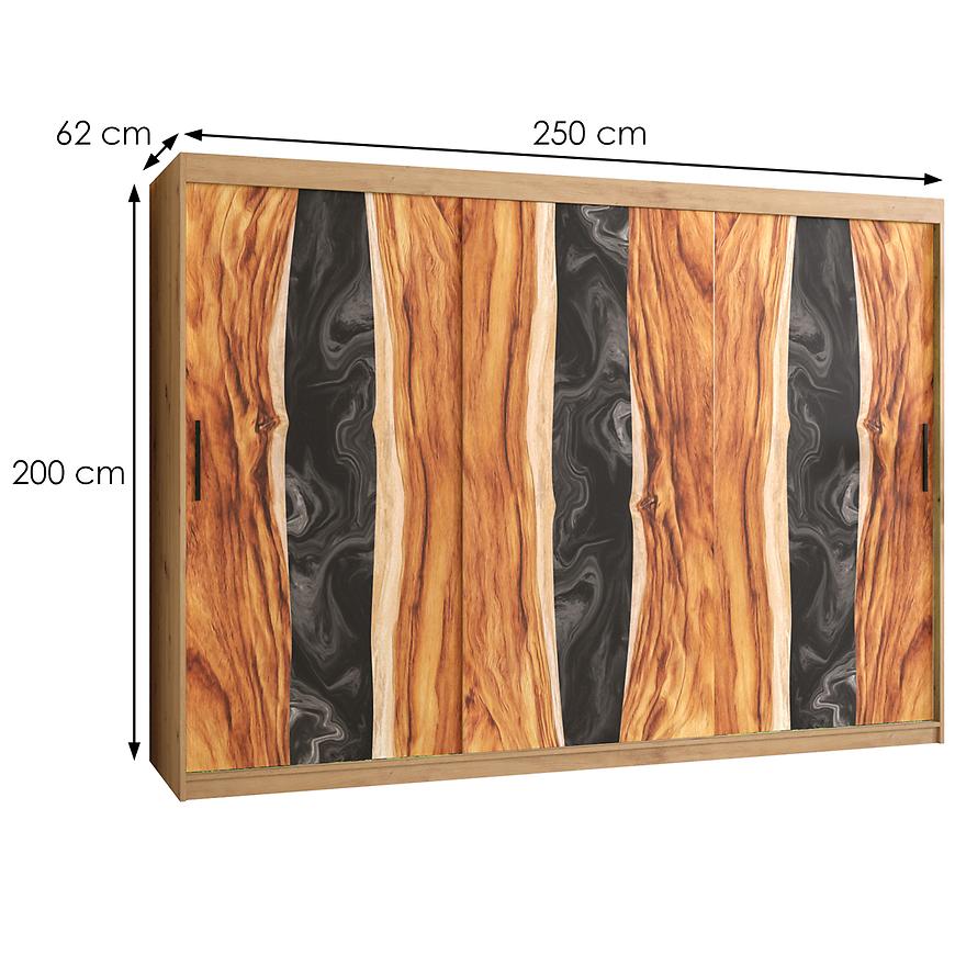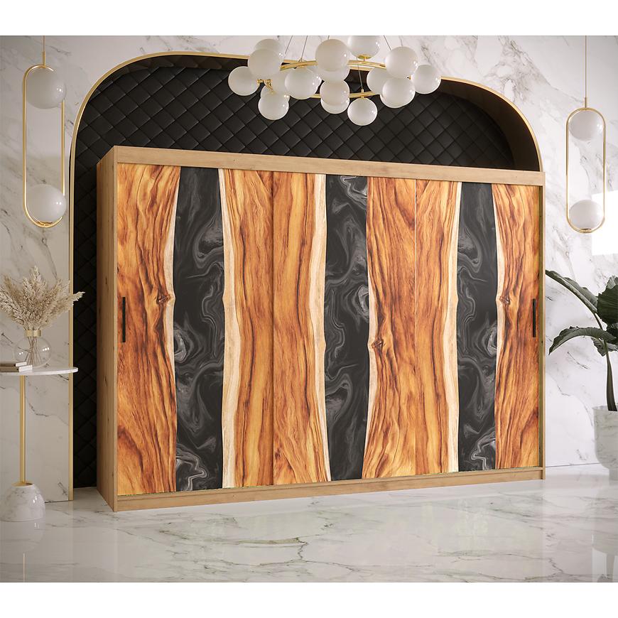 Wzór na frontach szafy nie jest jedynie naklejką – to autentyczna manifestacja jakości. Płaskie i gładkie powierzchnie tworzą elegancką całość, nadając pomieszczeniu wyjątkowy charakter. Prowadnice aluminiowe gwarantują płynne przesuwanie drzwi, sprawiając, że korzystanie z szafy staje się komfortowym doświadczeniem.