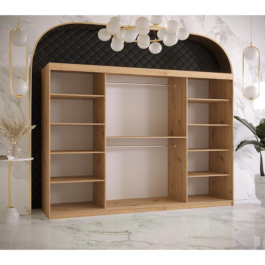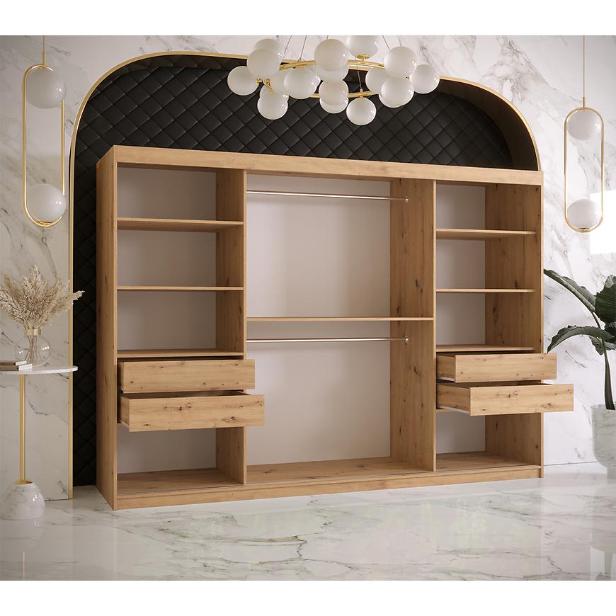 Trzydrzwiowy segment z drzwiami przesuwnymi oferuje wyjątkową przestrzeń przechowywania z myślą o Twoich potrzebach. Wnętrze szafy zostało inteligentnie zaprojektowane, wyposażone w dwa praktyczne drążki na ubrania, umożliwiające zorganizowanie garderoby w sposób funkcjonalny i estetyczny.