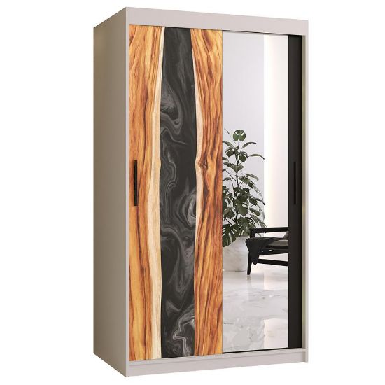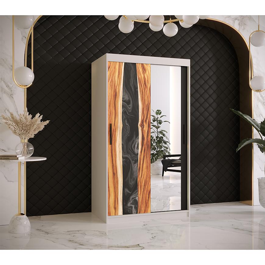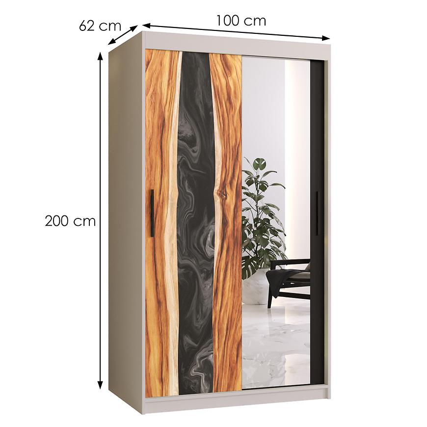 Wzór na frontach szafy nie jest jedynie naklejką – to autentyczna manifestacja jakości. Płaskie i gładkie powierzchnie tworzą elegancką całość, nadając pomieszczeniu wyjątkowy charakter. Prowadnice aluminiowe gwarantują płynne przesuwanie drzwi, sprawiając, że korzystanie z szafy staje się komfortowym doświadczeniem.