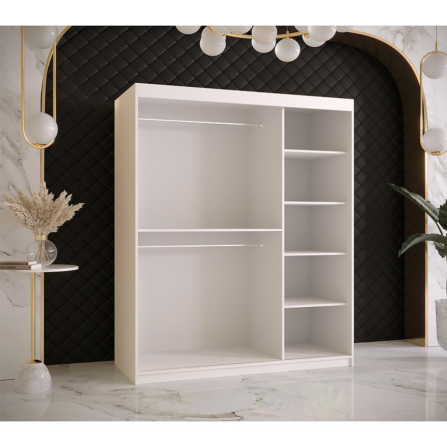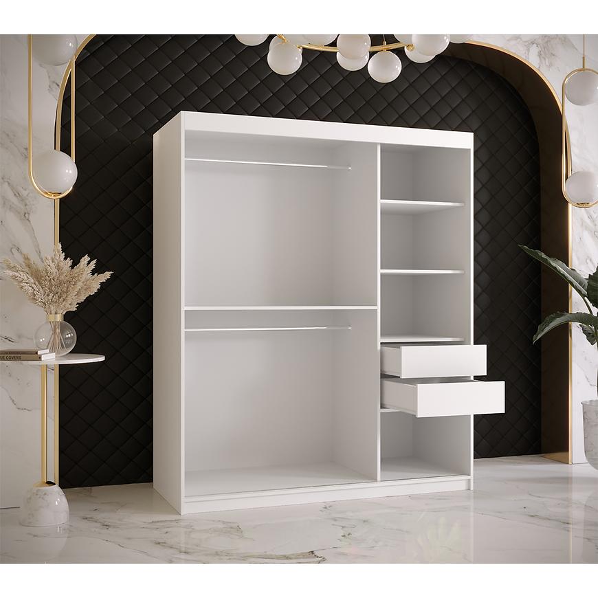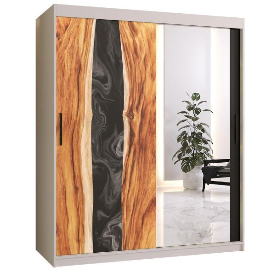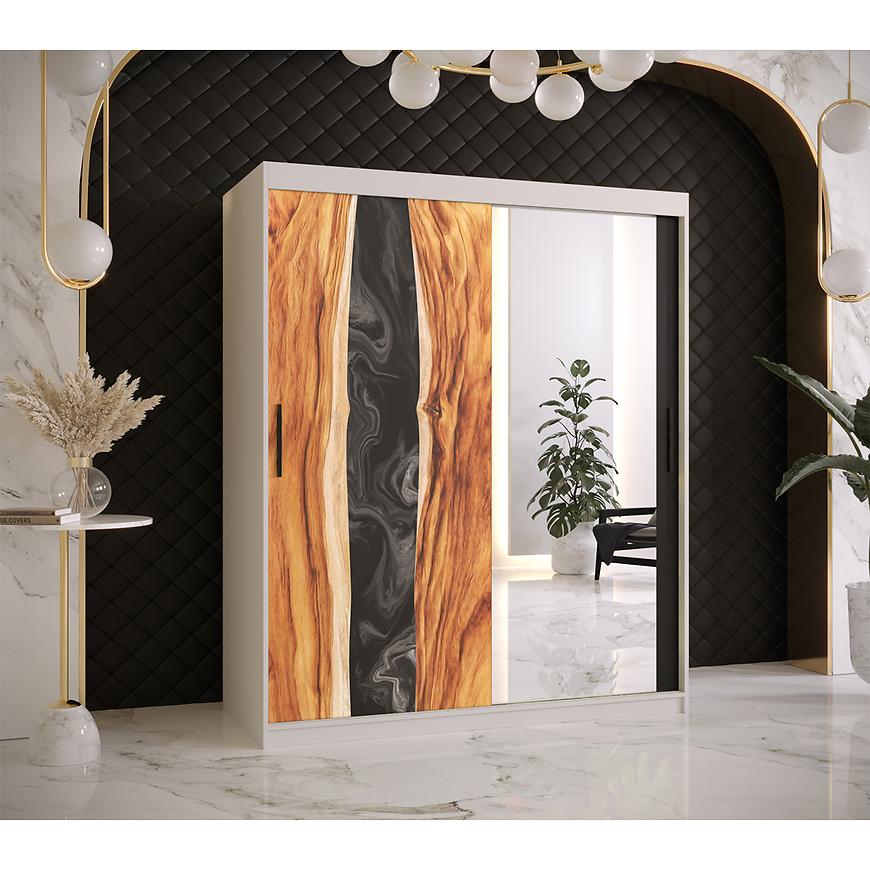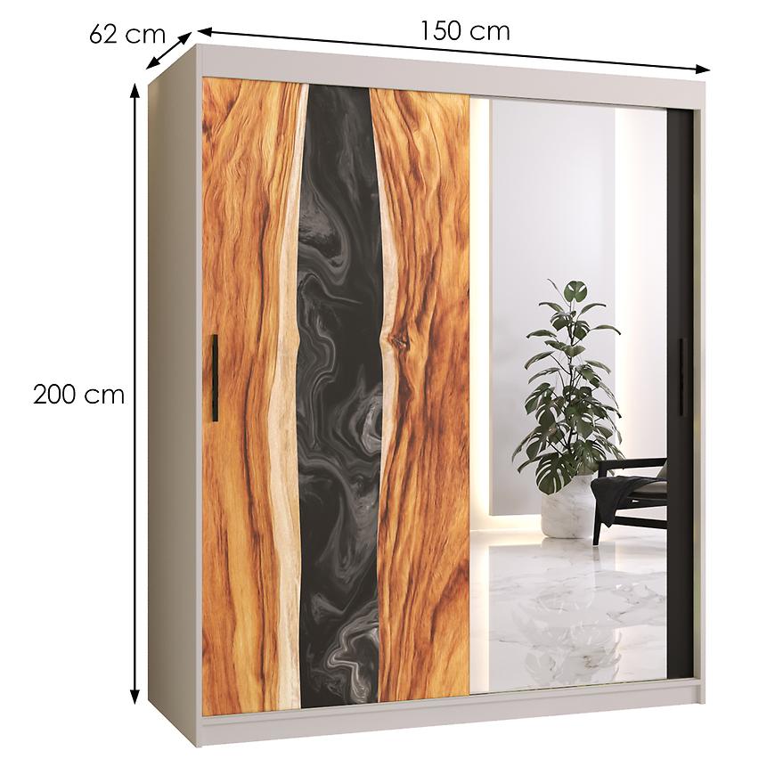 Wzór na frontach szafy nie jest jedynie naklejką – to autentyczna manifestacja jakości. Płaskie i gładkie powierzchnie tworzą elegancką całość, nadając pomieszczeniu wyjątkowy charakter. Prowadnice aluminiowe gwarantują płynne przesuwanie drzwi, sprawiając, że korzystanie z szafy staje się komfortowym doświadczeniem.