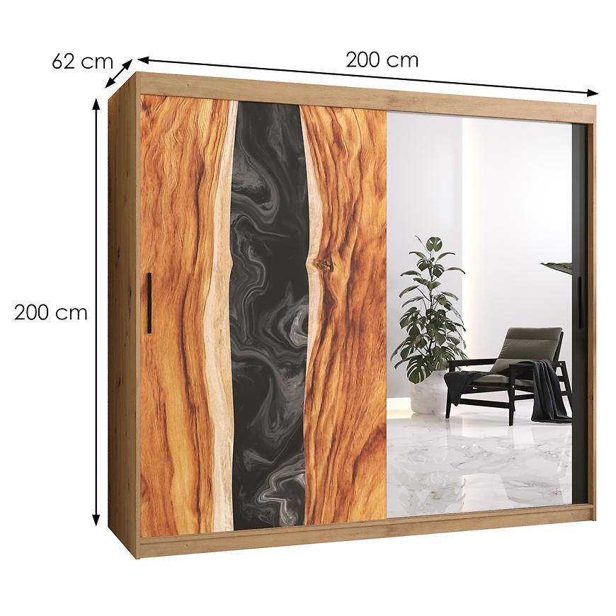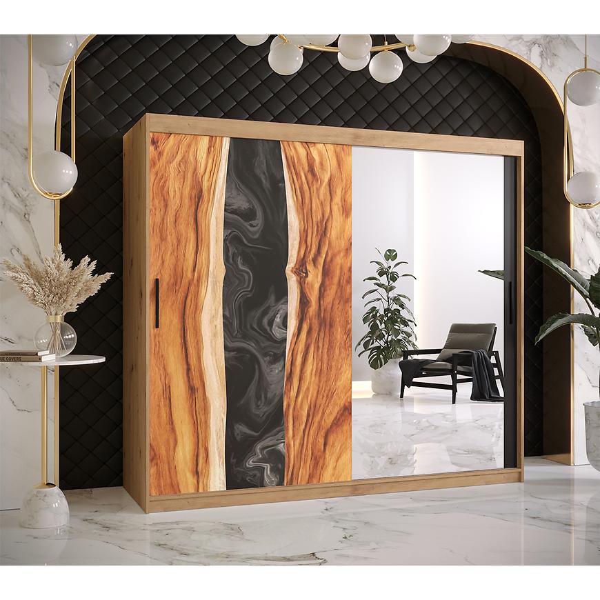 Szafa Resin II to doskonałe połączenie funkcjonalności, stylu i trwałości. Jej dwudrzwiowa konstrukcja z drzwiami przesuwnymi zapewnia łatwy dostęp do wnętrza, jednocześnie oszczędzając miejsce w pomieszczeniu. Kolor frontów utrzymany w drewnopodobnym wzorze nadaje szafie eleganckiego i naturalnego wyglądu, harmonizując z korpusem w kolorze dąb artisan.