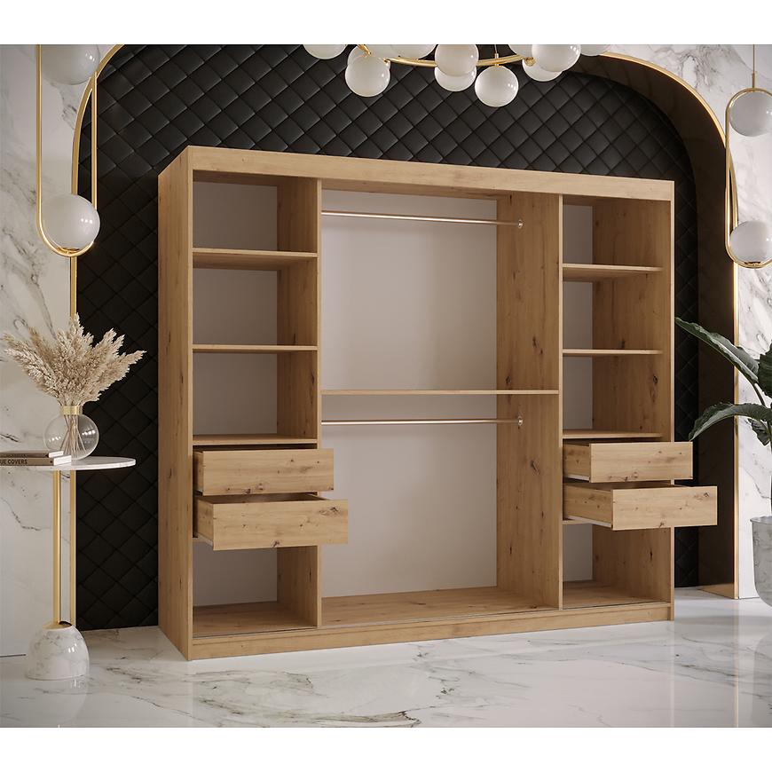 Dwudrzwiowy segment z drzwiami przesuwnymi oferuje wyjątkową przestrzeń przechowywania z myślą o Twoich potrzebach. Wnętrze szafy zostało inteligentnie zaprojektowane, wyposażone w dwa praktyczne drążki na ubrania, umożliwiające zorganizowanie garderoby w sposób funkcjonalny i estetyczny.