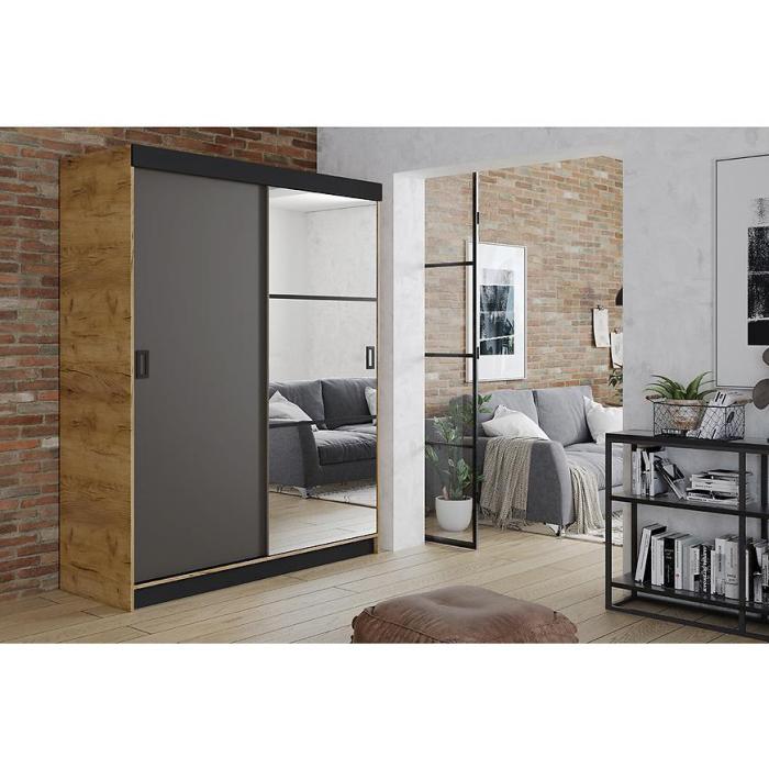 Szafa przesuwna Retro to propozycja do pokoju dziennego, ale znajdzie swoje miejsce również w innym pomieszczeniu, jak na przykład - przedpokój czy garderobie. Materiał wykonania to płyta wiórowa laminowana. Szafa posiada półki oraz drążek na ubrania. Mebel posiada lustro, które sprawi, że pomieszczenie stanie się optycznie większe. Nowoczesny styl mebli wpadnie do gustu każdemu, kto poszukuje eleganckiego, klasycznego, a zarazem nowoczesnego umeblowania. Idealnie wpasuje się w większość aranżacji. Przeznaczona do samodzielnego montażu.