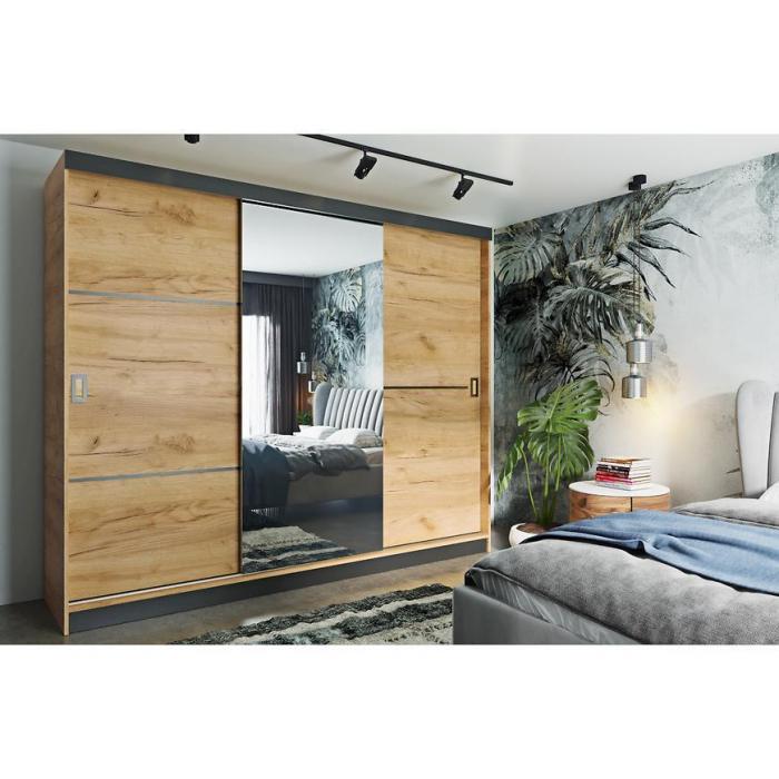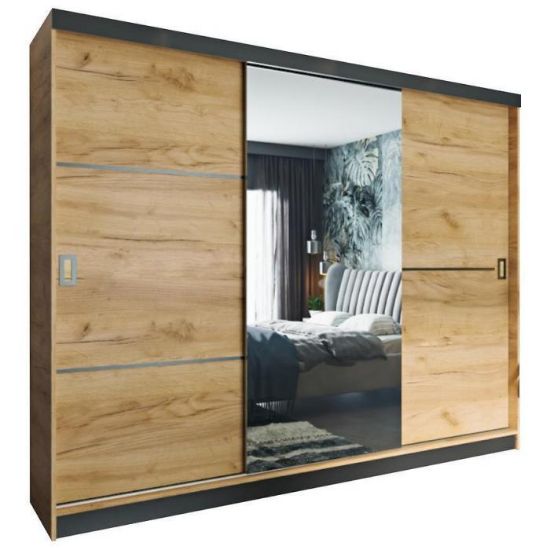 Szafa w kolorze craft złoty z kolekcji Retro to doskonała propozycja do pokoju dziennego, ale znajdzie swoje miejsce również w innym pomieszczeniu, jak na przykład - przedpokój czy garderobie, sypialni. Materiał wykonania to płyta laminowana. Szafa posiada półki, drążek na ubrania. Czarne wstawki i minimalistyczne elementy w postaci rączek dodają charakteru. Szafa dostępna w wersji z lustrem, dlatego właściciele mniejszych mieszkań z pewnością docenią takie rozwiązanie, nie musząc gospodarować dodatkowej przestrzeni na lustro. Wygląd szafy sprawi, że wpasuje się w większość aranżacji. Szafa będzie świetnym miejscem do wieszania ubrań, na buty lub inne domowe tekstylia. Nowoczesny styl mebli wpadnie do gustu każdemu, kto poszukuje eleganckiego, klasycznego, a zarazem nowoczesnego umeblowania. Szafa przeznaczona do samodzielnego montażu.