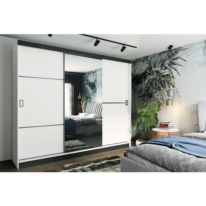Szafa w kolorze białym/czarny z kolekcji Retro to doskonała propozycja do pokoju dziennego, ale znajdzie swoje miejsce również w innym pomieszczeniu, jak na przykład - przedpokój czy garderobie, sypialni. Materiał wykonania to płyta laminowana. Szafa posiada półki, drążek na ubrania. Czarne wstawki i minimalistyczne elementy w postaci rączek dodają charakteru. Szafa dostępna w wersji z lustrem, dlatego właściciele mniejszych mieszkań z pewnością docenią takie rozwiązanie, nie musząc gospodarować dodatkowej przestrzeni na lustro. Wygląd szafy sprawi, że wpasuje się w większość aranżacji. Szafa będzie świetnym miejscem do wieszania ubrań, na buty lub inne domowe tekstylia. Nowoczesny styl mebli wpadnie do gustu każdemu, kto poszukuje eleganckiego, klasycznego, a zarazem nowoczesnego umeblowania. Szafa przeznaczona do samodzielnego montażu.
