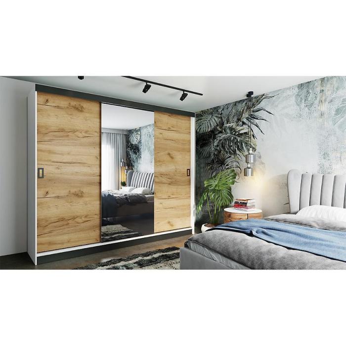 Szafa przesuwna Retro to propozycja do pokoju dziennego, ale znajdzie swoje miejsce również w innym pomieszczeniu, jak na przykład - przedpokój czy garderobie. Materiał wykonania to płyta wiórowa laminowana. Szafa posiada lustro, które sprawi, że pomieszczenie stanie się optycznie większe. Nowoczesny styl mebli wpadnie do gustu każdemu, kto poszukuje eleganckiego, klasycznego, a zarazem nowoczesnego umeblowania. Idealnie wpasuje się w większość aranżacji. Przeznaczona do samodzielnego montażu.