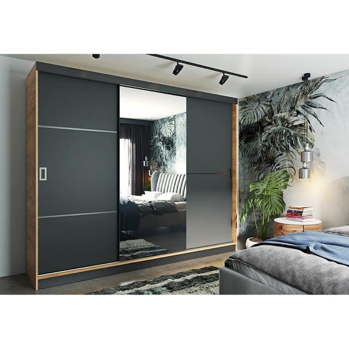 Szafa przesuwna Retro to propozycja do pokoju dziennego, ale znajdzie swoje miejsce również w innym pomieszczeniu, jak na przykład - przedpokój czy garderobie. Materiał wykonania to płyta wiórowa laminowana. Szafa posiada lustro, które sprawi, że pomieszczenie stanie się optycznie większe. Nowoczesny styl mebli wpadnie do gustu każdemu, kto poszukuje eleganckiego, klasycznego, a zarazem nowoczesnego umeblowania. Idealnie wpasuje się w większość aranżacji. Przeznaczona do samodzielnego montażu.