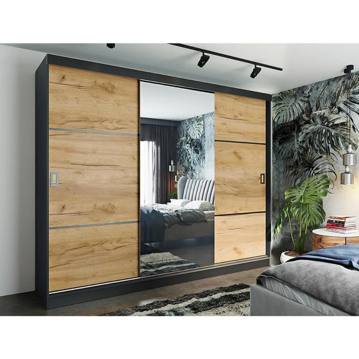 Szafa przesuwna Retro to propozycja do pokoju dziennego, ale znajdzie swoje miejsce również w innym pomieszczeniu, jak na przykład - przedpokój czy garderobie. Materiał wykonania to płyta wiórowa laminowana. Szafa posiada lustro, które sprawi, że pomieszczenie stanie się optycznie większe. Nowoczesny styl mebli wpadnie do gustu każdemu, kto poszukuje eleganckiego, klasycznego, a zarazem nowoczesnego umeblowania. Idealnie wpasuje się w większość aranżacji. Przeznaczona do samodzielnego montażu.